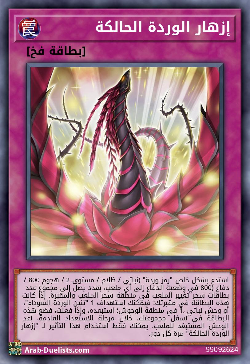 استدع بشكل خاص "رمز وردة" (نباتي / ظلام / مستوى 2 / هجوم 800 / دفاع 800) في وضعية الدفاع إلى أي ملعب، بعدد يصل إلى مجموع عدد بطاقات سحر تغيير الملعب في منطقة سحر الملعب والمقبرة. إذا كانت هذه البطاقة في مقبرتك: فيمكنك استهداف 1 "تنين الوردة السوداء"، أو وحش نباتي 1، في منطقة الوحوش؛ استبعده، وإذا فعلت، فضع هذه البطاقة في أسفل مجموعتك. خلال مرحلة الاستعداد القادمة، أعد الوحش المستبعَد للملعب. يمكنك فقط استخدام هذا التأثير لـ "إزهار الوردة الحالكة" مرة كل دور.