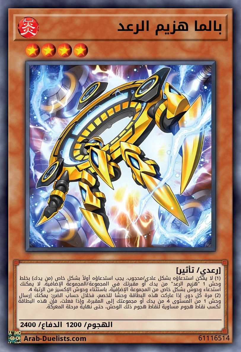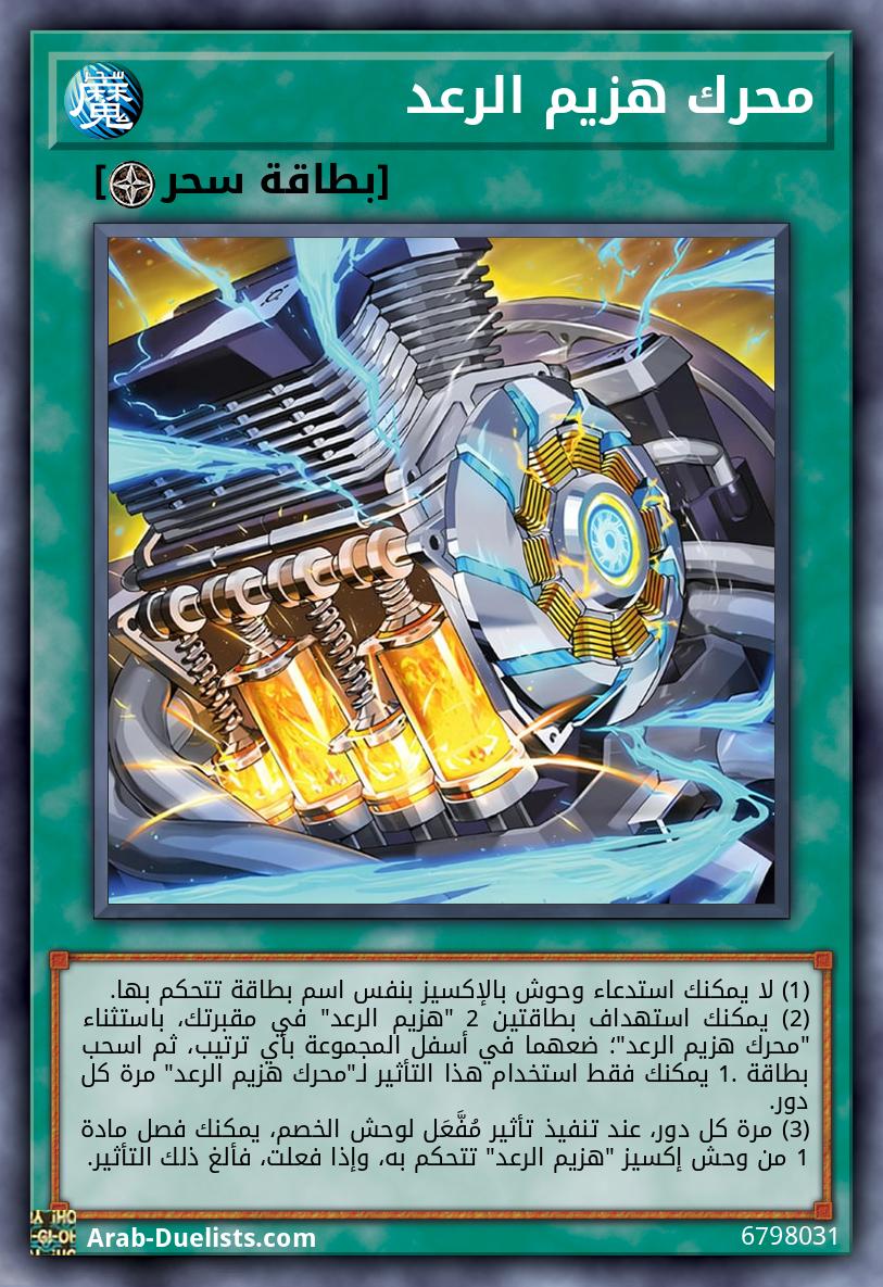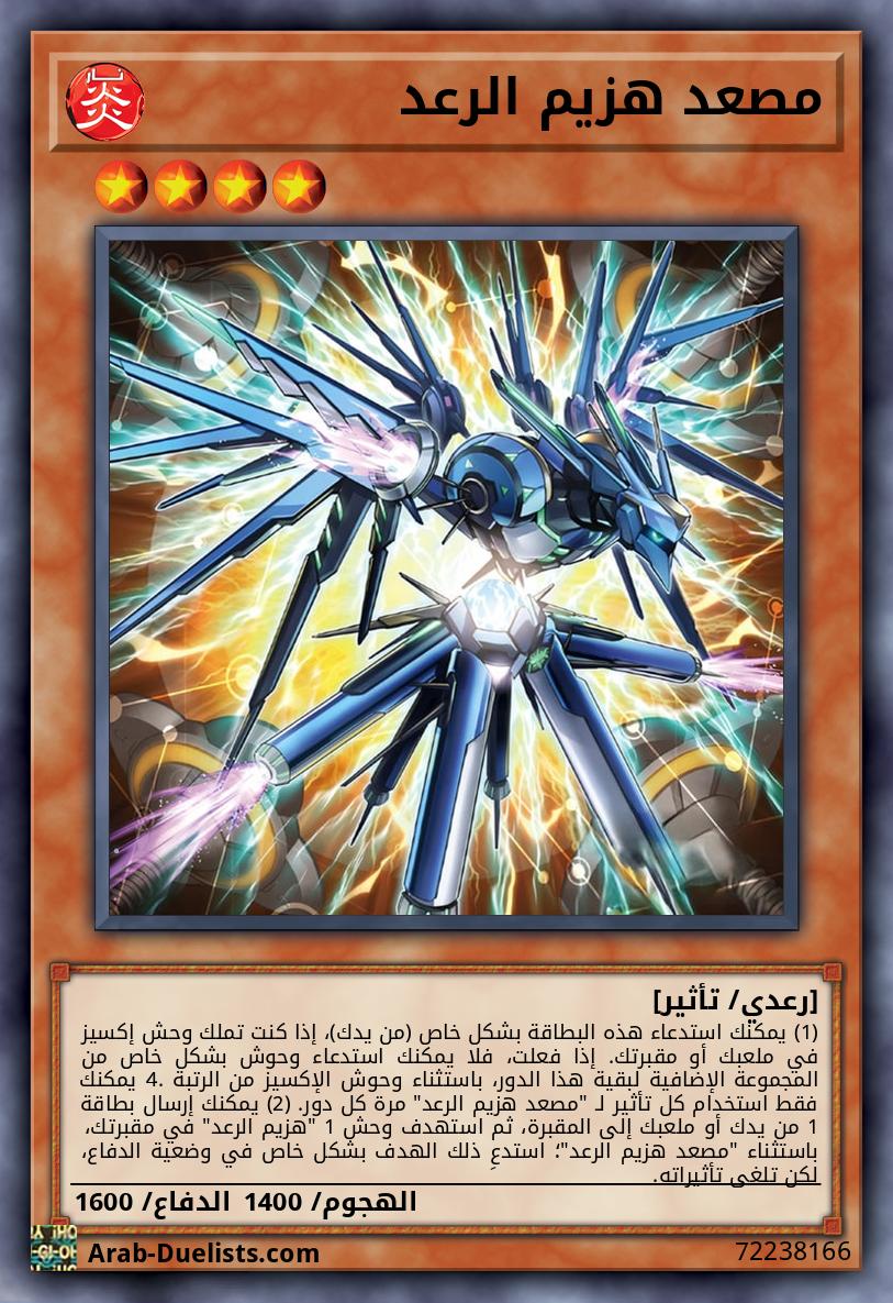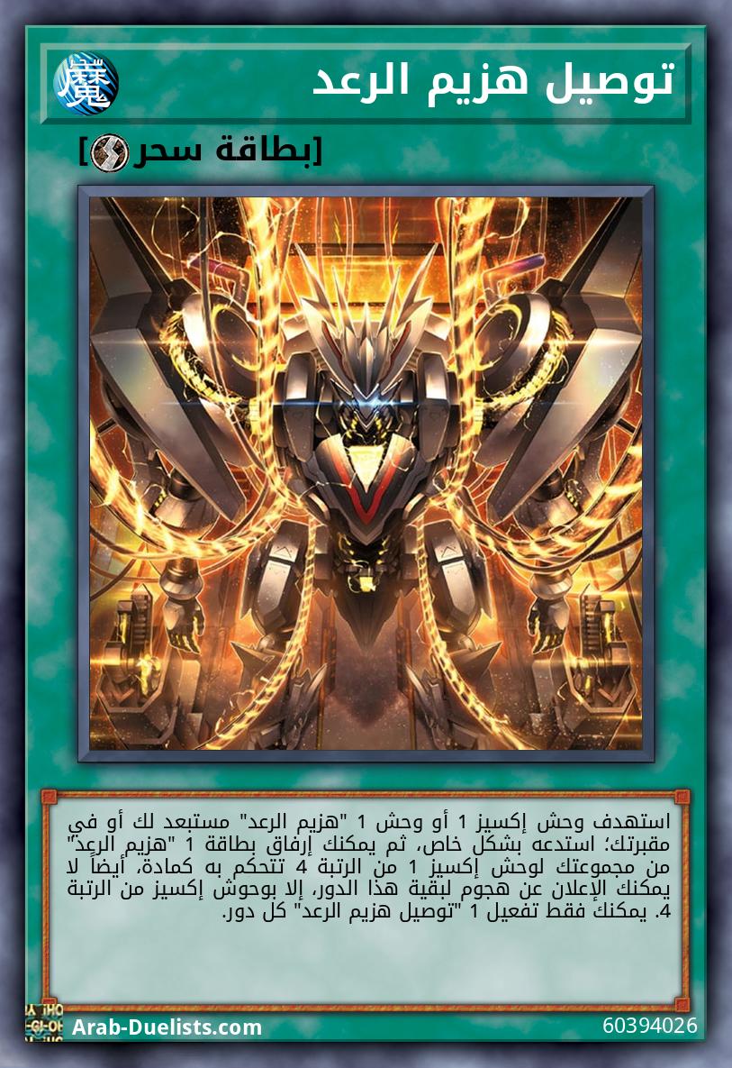 وحشان 2 أو أكثر "هزيم الرعد" من المستوى 4 (1)عندما يُفعل خصمك بطاقة أو تأثيرًا (تأثير سريع): يمكنك فصل مادة 1 من هذه البطاقة، ثم استهدف بطاقة 1 في الملعب؛ دَمِّرها. يمكنك استخدام كل من التأثيرين التاليين لـ "هزيم الرعد الهادر" مرة كل دور. (2) إذا تم استدعاء هذه البطاقة بشكل خاص: يمكنك إرفاق وحش 1 من مقبرتك لهذه البطاقة كمادة. (3) إذا كان سيتم تدمير وحش(وحوش) إكسيز تتحكم به في معركة أو بتأثير بطاقة، فيمكنك فصل مادة 1 من هذه البطاقة بدلاً من ذلك.