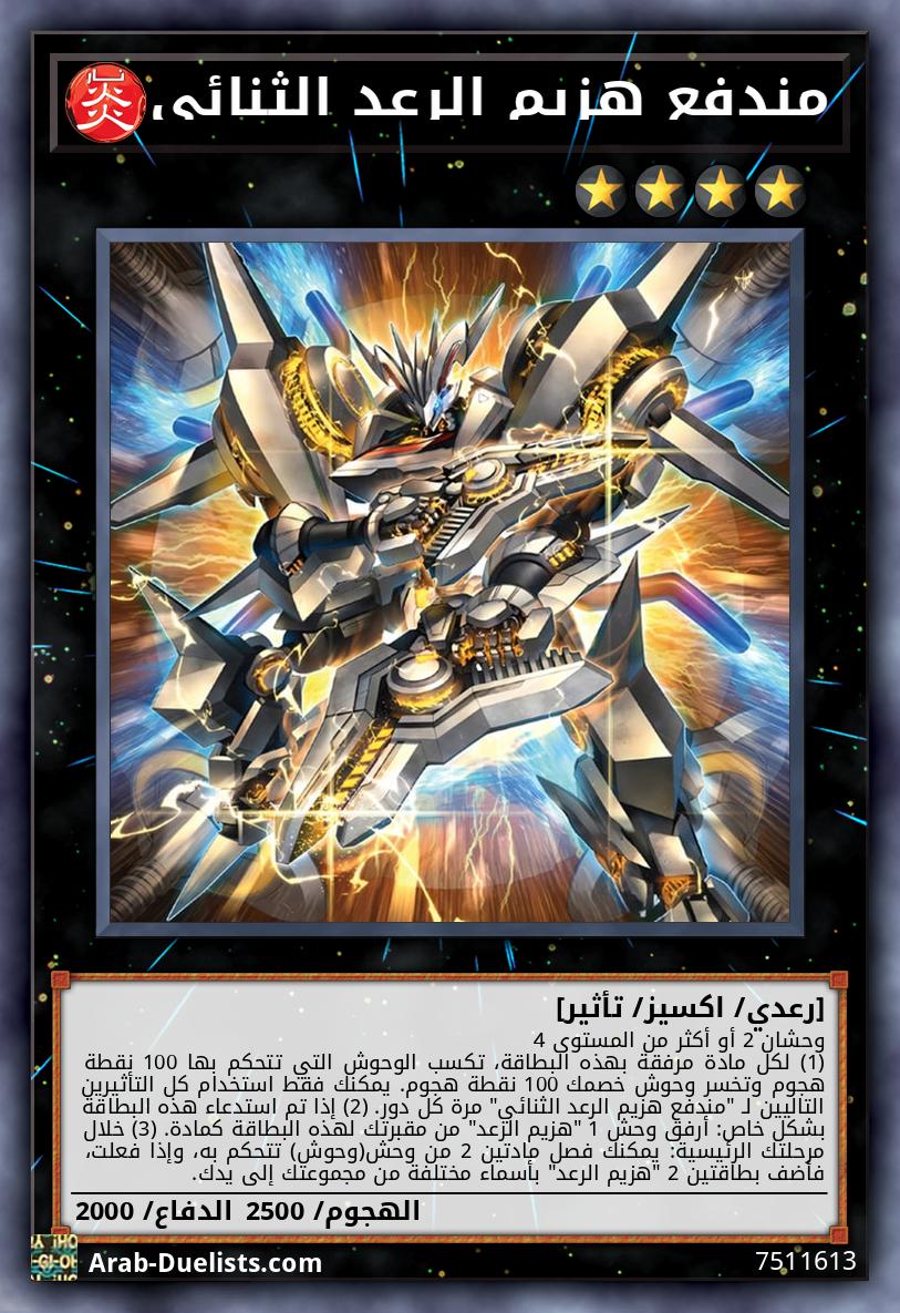 وحشان 2 أو أكثر من المستوى 4 (1) لكل مادة مرفقة بهذه البطاقة، تكسب الوحوش التي تتحكم بها 100 نقطة هجوم وتخسر وحوش خصمك 100 نقطة هجوم. يمكنك فقط استخدام كل التأثيرين التاليين لـ "مندفع هزيم الرعد الثنائي" مرة كل دور. (2) إذا تم استدعاء هذه البطاقة بشكل خاص: أرفق وحش 1 "هزيم الرعد" من مقبرتك لهذه البطاقة كمادة. (3) خلال مرحلتك الرئيسية: يمكنك فصل مادتين 2 من وحش(وحوش) تتحكم به، وإذا فعلت، فأضف بطاقتين 2 "هزيم الرعد" بأسماء مختلفة من مجموعتك إلى يدك.