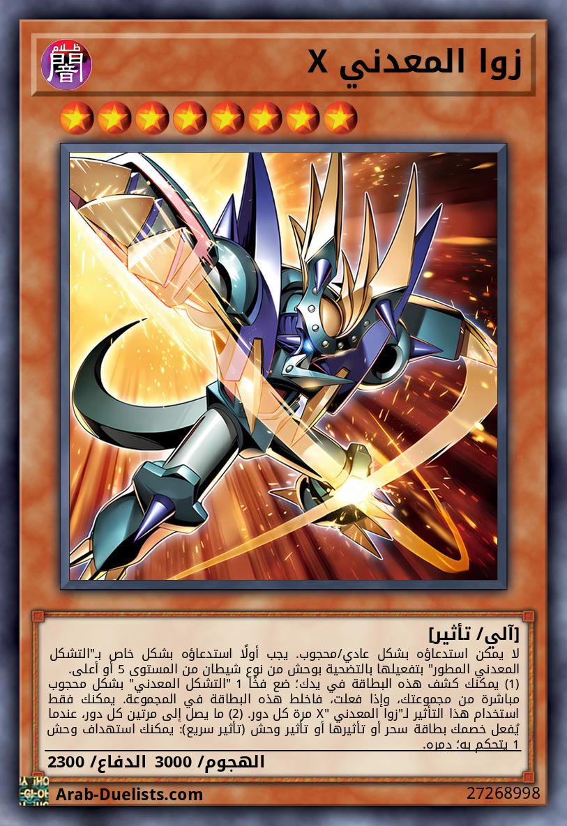 لا يمكن استدعاؤه بشكل عادي/محجوب. يجب أولًا استدعاؤه بشكل خاص بـ"التشكل المعدني المطور" بتفعيلها بالتضحية بوحش من نوع شيطان من المستوى 5 أو أعلى. (1) يمكنك كشف هذه البطاقة في يدك؛ ضع فخًا 1 "التشكل المعدني" بشكل محجوب مباشرة من مجموعتك، وإذا فعلت، فاخلط هذه البطاقة في المجموعة. يمكنك فقط استخدام هذا التأثير لـ"زوا المعدني X" مرة كل دور. (2) ما يصل إلى مرتين كل دور، عندما يُفعل خصمك بطاقة سحر أو تأثيرها أو تأثير وحش (تأثير سريع): يمكنك استهداف وحش 1 يتحكم به؛ دمره.
