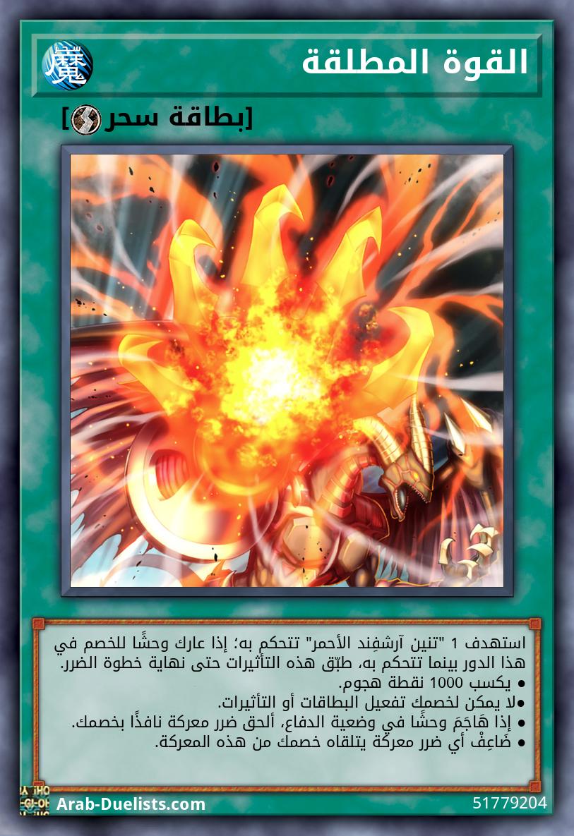 استهدف 1 "تنين آرشفِند الأحمر" تتحكم به؛ إذا عارك وحشًا للخصم في هذا الدور بينما تتحكم به، طبّق هذه التأثيرات حتى نهاية خطوة الضرر. ● يكسب 1000 نقطة هجوم. ●لا يمكن لخصمك تفعيل البطاقات أو التأثيرات. ● إذا هَاجَمَ وحشًا في وضعية الدفاع، ألحق ضرر معركة نافذًا بخصمك. ● ضَاعِفْ أي ضرر معركة يتلقاه خصمك من هذه المعركة.