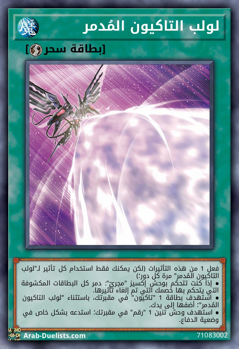 فعل 1 من هذه التأثيرات (لكن يمكنك فقط استخدام كل تأثير لـ"لولب التاكيون المُدمر" مرة كل دور؛) ● إذا كنت تتحكم بوحش إكسيز "مجريّ": دمر كل البطاقات المكشوفة التي يتحكم بها خصمك التي تم إلغاء تأثيرها. ● استهدف بطاقة 1 "تاكيون" في مقبرتك، باستثناء "لولب التاكيون المُدمر"؛ أضفها إلى يدك. ● استهدف وحش تنين 1 "رقم" في مقبرتك؛ استدعه بشكل خاص في وضعية الدفاع.