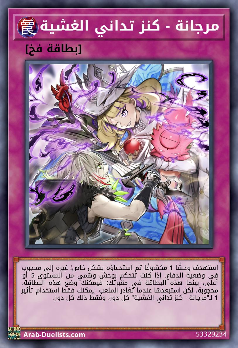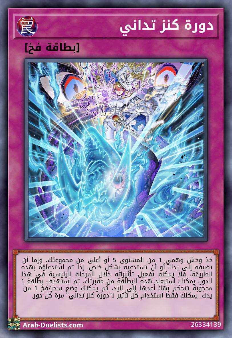 خذ وحش وهمي 1 من المستوى 5 أو أعلى من مجموعتك، وإما أن تضيفه إلى يدك أو أن تستدعيه بشكل خاص. إذا تم استدعاؤه بهذه الطريقة، فلا يمكنه تفعيل تأثيراته خلال المرحلة الرئيسية في هذا الدور. يمكنك استبعاد هذه البطاقة من مقبرتك، ثم استهدف بطاقة 1 محجوبة تتحكم بها؛ أعدها إلى اليد، ثم يمكنك وضع سحر/فخ 1 من يدك. يمكنك فقط استخدام كل تأثير لـ"دورة كنز تداني" مرة كل دور.