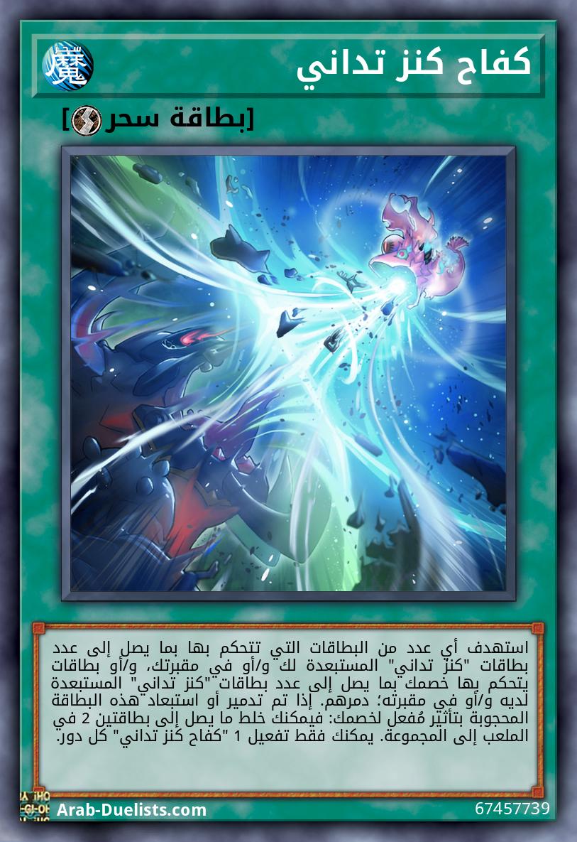 استهدف أي عدد من البطاقات التي تتحكم بها بما يصل إلى عدد بطاقات "كنز تداني" المستبعدة لك و/أو في مقبرتك، و/أو بطاقات يتحكم بها خصمك بما يصل إلى عدد بطاقات "كنز تداني" المستبعدة لديه و/أو في مقبرته؛ دمرهم. إذا تم تدمير أو استبعاد هذه البطاقة المحجوبة بتأثير مُفعل لخصمك: فيمكنك خلط ما يصل إلى بطاقتين 2 في الملعب إلى المجموعة. يمكنك فقط تفعيل 1 "كفاح كنز تداني" كل دور.