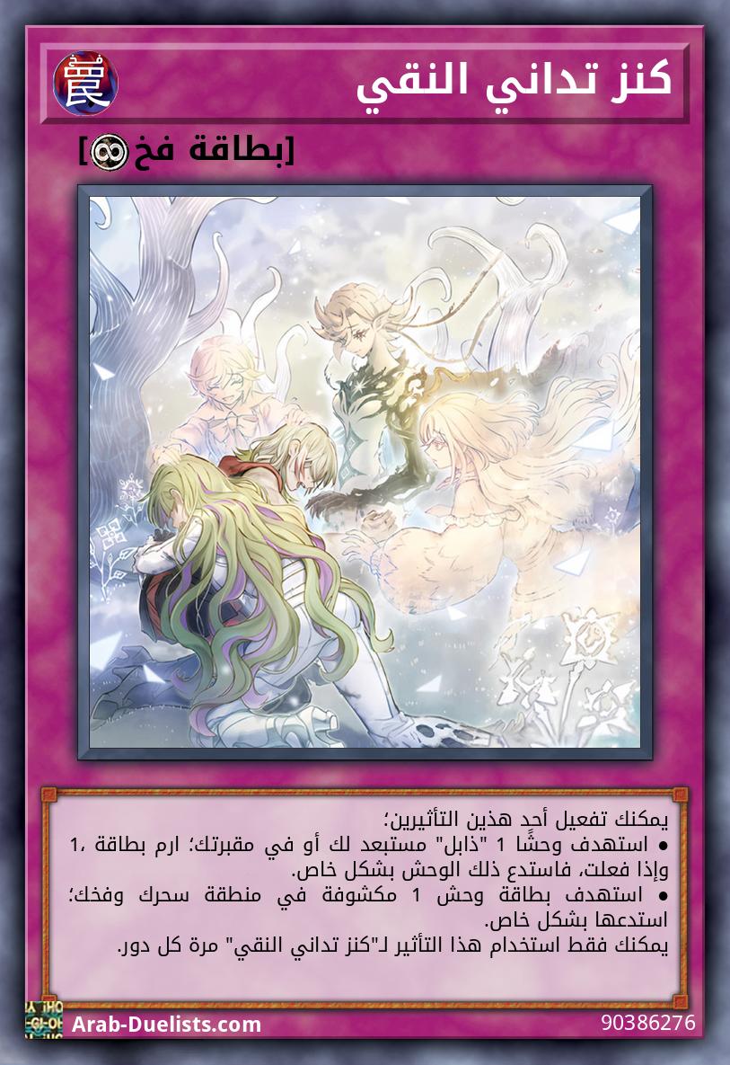 يمكنك تفعيل أحد هذين التأثيرين؛ ● استهدف وحشًا 1 "ذابل" مستبعد لك أو في مقبرتك؛ ارم بطاقة 1، وإذا فعلت، فاستدع ذلك الوحش بشكل خاص. ● استهدف بطاقة وحش 1 مكشوفة في منطقة سحرك وفخك؛ استدعها بشكل خاص. يمكنك فقط استخدام هذا التأثير لـ"كنز تداني النقي" مرة كل دور.
