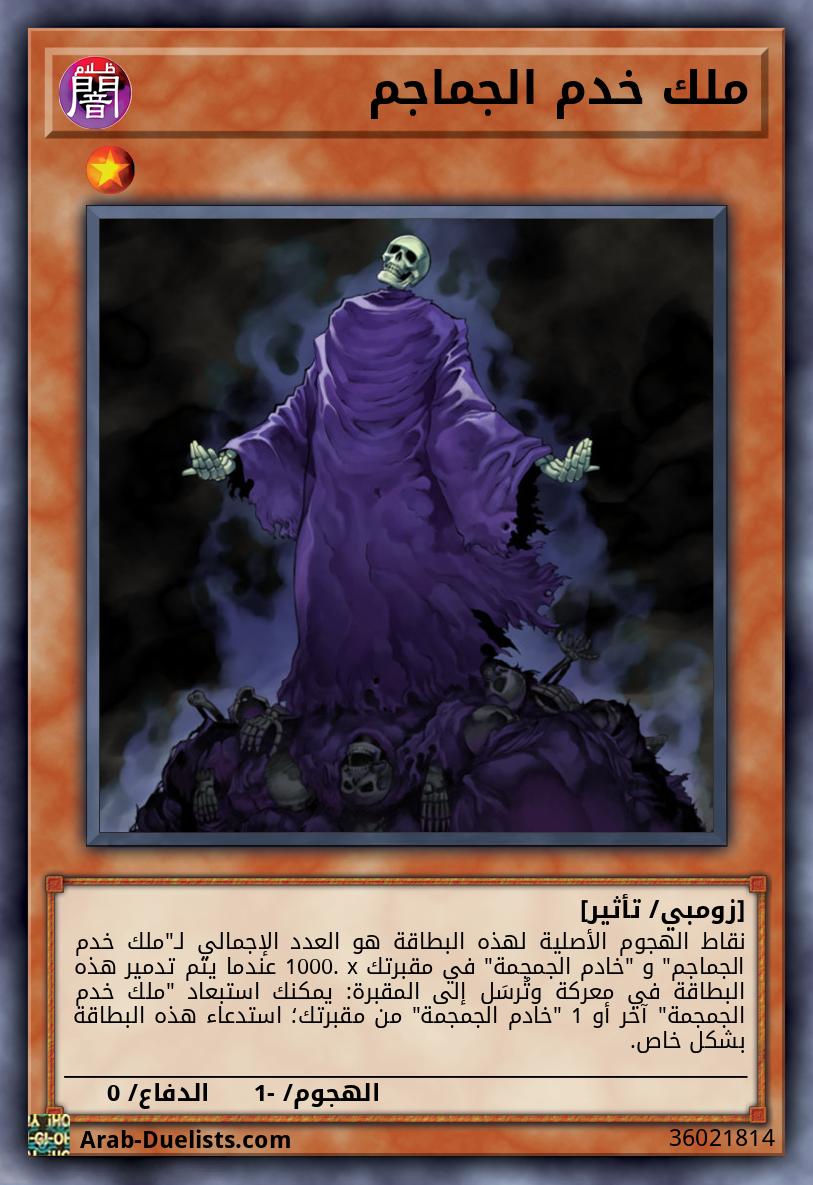نقاط الهجوم الأصلية لهذه البطاقة هو العدد الإجمالي لـ"ملك خدم الجماجم" و "خادم الجمجمة" في مقبرتك x 1000. عندما يتم تدمير هذه البطاقة في معركة وتُرسَل إلى المقبرة: يمكنك استبعاد "ملك خدم الجمجمة" آخر أو 1 "خادم الجمجمة" من مقبرتك؛ استدعاء هذه البطاقة بشكل خاص.