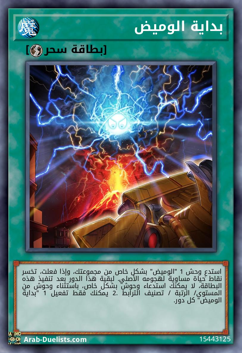 استدعِ وحش 1 "الوميض" بشكل خاص من مجموعتك، وإذا فعلت، تخسر نقاط حياة مساوية لهجومه الأصلي. لبقية هذا الدور بعد تنفيذ هذه البطاقة، لا يمكنك استدعاء وحوش بشكل خاص، باستثناء وحوش من المستوى/ الرتبة / تصنيف الترابط 2. يمكنك فقط تفعيل 1 "بداية الوميض" كل دور.