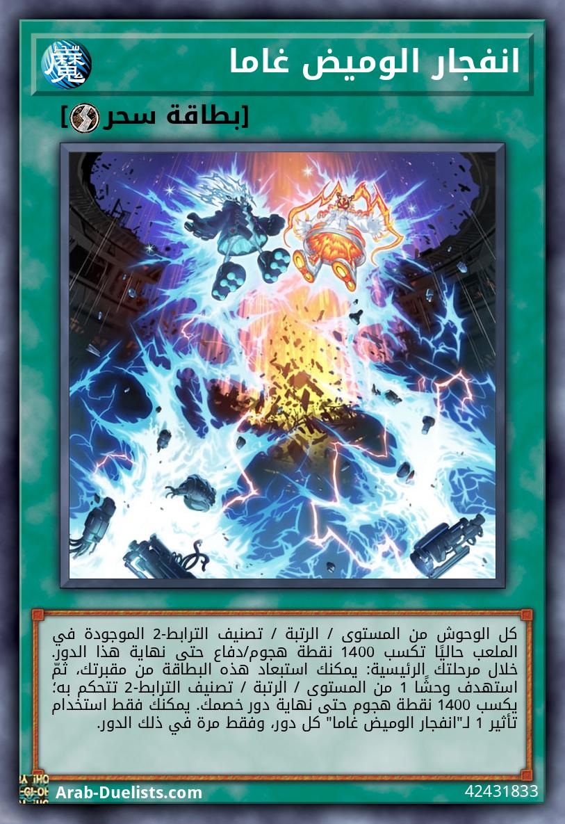 كل الوحوش من المستوى / الرتبة / تصنيف الترابط-2 الموجودة في الملعب حاليًا تكسب 1400 نقطة هجوم/دفاع حتى نهاية هذا الدور. خلال مرحلتك الرئيسية: يمكنك استبعاد هذه البطاقة من مقبرتك، ثمّ استهدف وحشًا 1 من المستوى / الرتبة / تصنيف الترابط-2 تتحكم به؛ يكسب 1400 نقطة هجوم حتى نهاية دور خصمك. يمكنك فقط استخدام تأثير 1 لـ"انفجار الوميض غاما" كل دور، وفقط مرة في ذلك الدور.