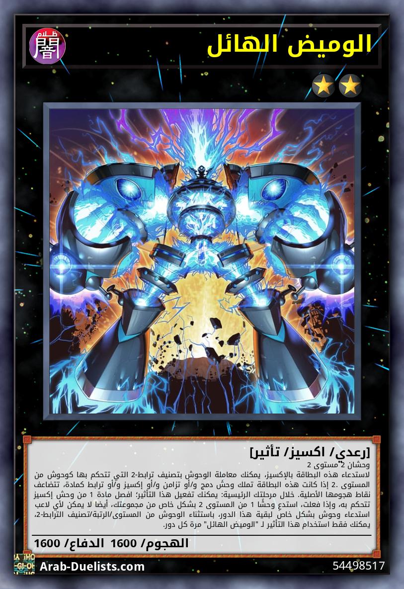 وحشان 2 مستوى 2 لاستدعاء هذه البطاقة بالإكسيز، يمكنك معاملة الوحوش بتصنيف ترابط-2 التي تتحكم بها كوحوش من المستوى 2. إذا كانت هذه البطاقة تملك وحشَ دمج و/أو تزامن و/أو إكسيز و/أو ترابط كمادة، تتضاعف نقاط هجومها الأصلية. خلال مرحلتك الرئيسية: يمكنك تفعيل هذا التأثير؛ افصل مادة 1 من وحش إكسيز تتحكم به، وإذا فعلت، استدعِ وحشًا 1 من المستوى 2 بشكل خاص من مجموعتك، أيضا لا يمكن لأي لاعب استدعاء وحوش بشكل خاص لبقية هذا الدور، باستثناء الوحوش من المستوى/الرتبة/تصنيف الترابط-2، يمكنك فقط استخدام هذا التأثير لـ "الوميض الهائل" مرة كل دور.
