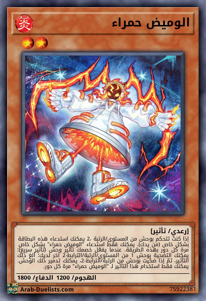إذا كنت تتحكم بوحش من المستوى/الرتبة 2، يمكنك استدعاء هذه البطاقة بشكل خاص (من يدك). يمكنك فقط استدعاء "الوميض حمراء" بشكل خاص مرة كل دور بهذه الطريقة. عندما يفعّل خصمك تأثير وحش (تأثير سريع): يمكنك التضحية بوحش 1 من المستوى/الرتبة/الترابط-2 آخر لديك؛ ألغ ذلك التأثير، ثمّ إذا ضحّيت بوحش من الرتبة/الترابط-2، يمكنك تدمير ذلك الوحش. يمكنك فقط استخدام هذا التأثير لـ "الوميض حمراء" مرة كل دور.
