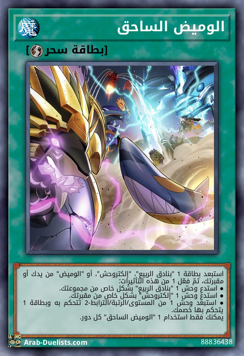استبعد بطاقة 1 "بنادق الربيع"، "إلكتروحش"، أو "الوميض" من يدك أو مقبرتك، ثمّ فعّل 1 من هذه التأثيرات؛ ● استدعِ وحش 1 "بنادق الربيع" بشكل خاص من مجموعتك. ● استدعِ وحش 1 "إلكتروحش" بشكل خاص من مقبرتك. ● استبعد وحش 1 من المستوى/الرتبة/الترابط-2 تتحكم به وبطاقة 1 يتحكم بها خصمك. يمكنك فقط استخدام 1 "الوميض الساحق" كل دور.