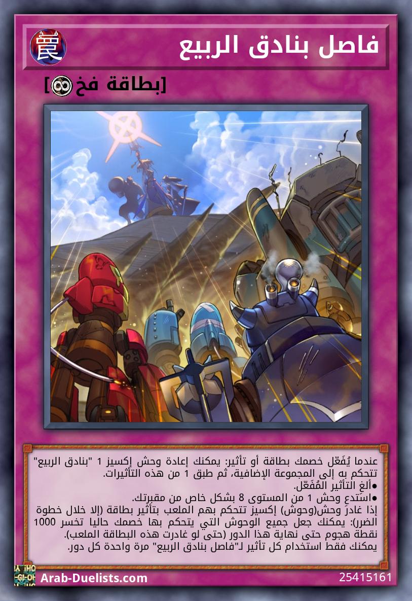 وحشان 2 أو أكثر من المستوى 8 يمكنك اختيار 1 من مناطق وحوش أو مناطق سحر وفخ خصمك؛ افصل أي عدد من مواد من هذه البطاقة، وإذا فعلت، دمّر نفس العدد من بطاقات خصمك في المناطق المختارة ومناطق الوحوش و/أو مناطق السحر والفخ المجاورة لها. خلال مرحلة خصمك الرئيسية أو مرحلة معركته (تأثير سريع): يمكنك استبعاد هذه البطاقة حتى مرحلة النهاية. يمكنك فقط استخدام كل تأثير لـ"سفينة بنادق الربيع - المُستَكشِف" مرة واحدة كل دور.