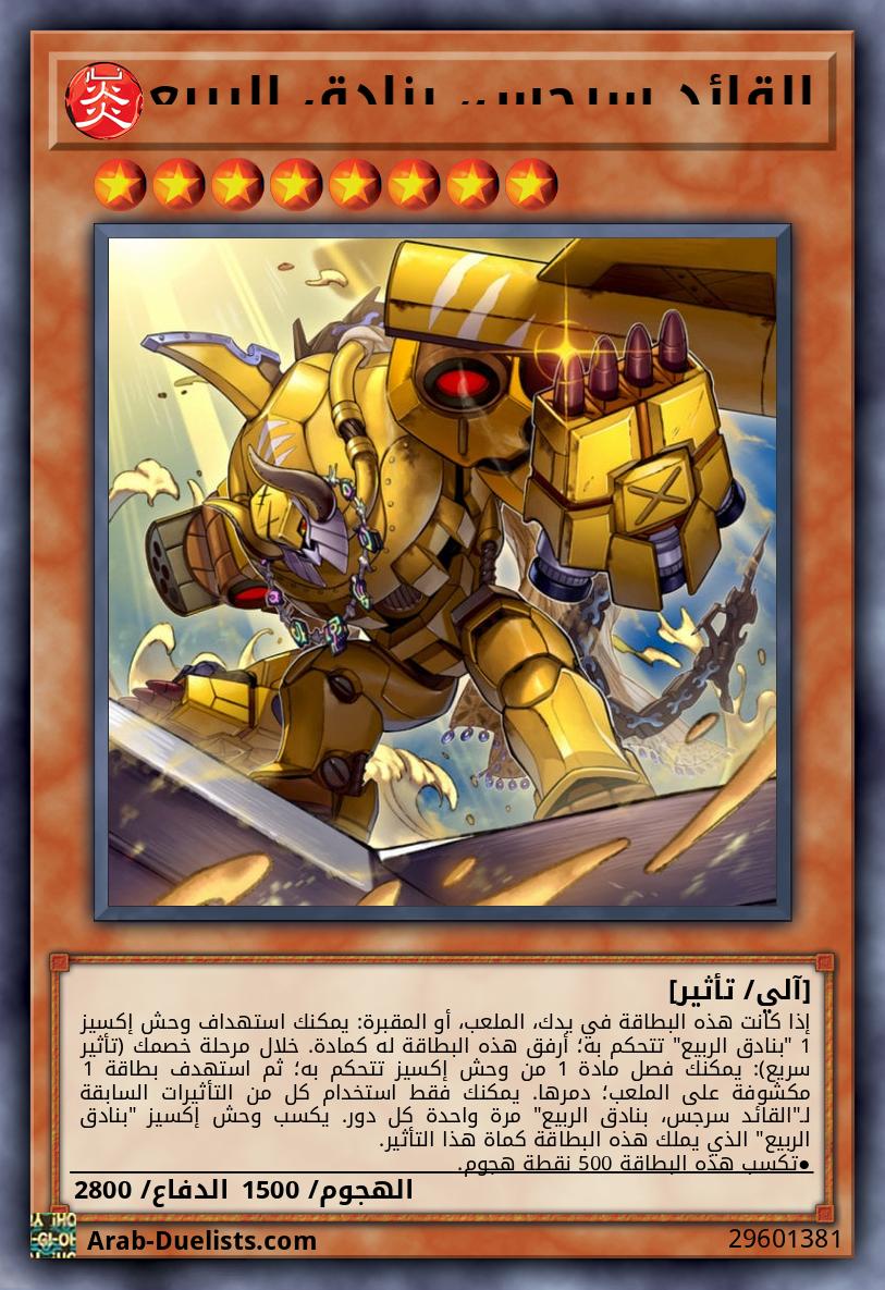 إذا كانت هذه البطاقة في يدك، الملعب، أو المقبرة: يمكنك استهداف وحش إكسيز 1 "بنادق الربيع" تتحكم به؛ أرفق هذه البطاقة له كمادة. خلال مرحلة خصمك (تأثير سريع): يمكنك فصل مادة 1 من وحش إكسيز تتحكم به؛ ثم استهدف بطاقة 1 مكشوفة على الملعب؛ دمرها. يمكنك فقط استخدام كل من التأثيرات السابقة لـ"القائد سرجس، بنادق الربيع" مرة واحدة كل دور. يكسب وحش إكسيز "بنادق الربيع" الذي يملك هذه البطاقة كماة هذا التأثير. ●تكسب هذه البطاقة 500 نقطة هجوم.