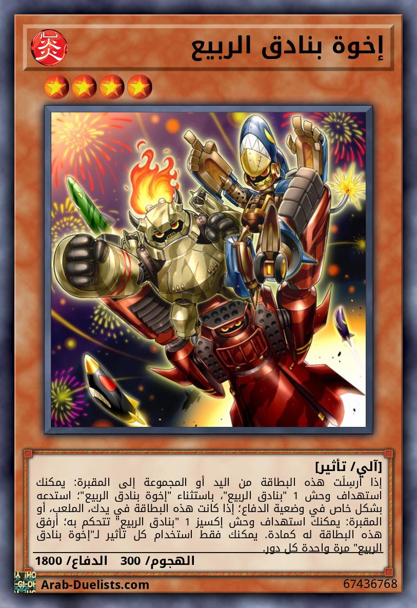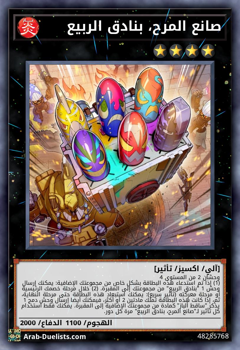 وحشان 2 من المستوى 4 (1) إذا تم استدعاء هذه البطاقة بشكل خاص من مجموعتك الإضافية: يمكنك إرسال وحش 1 "بنادق الربيع" من مجموعتك إلى المقبرة. (2) خلال مرحلة خصمك الرئيسية أو مرحلة معركته (تأثير سريع): يمكنك استبعاد هذه البطاقة حتى مرحلة النهاية، ثم، إذا كانت هذه البطاقة تملك مادتين 2 أو أكثر، فيمكنك أيضا إرسال وحش دمج 1 يذكر "ساقط ألباز" كمادة من مجموعتك الإضافية إلى المقبرة. يمكنك فقط استخدام كل تأثير لـ"صانع المرح، بنادق الربيع" مرة كل دور.