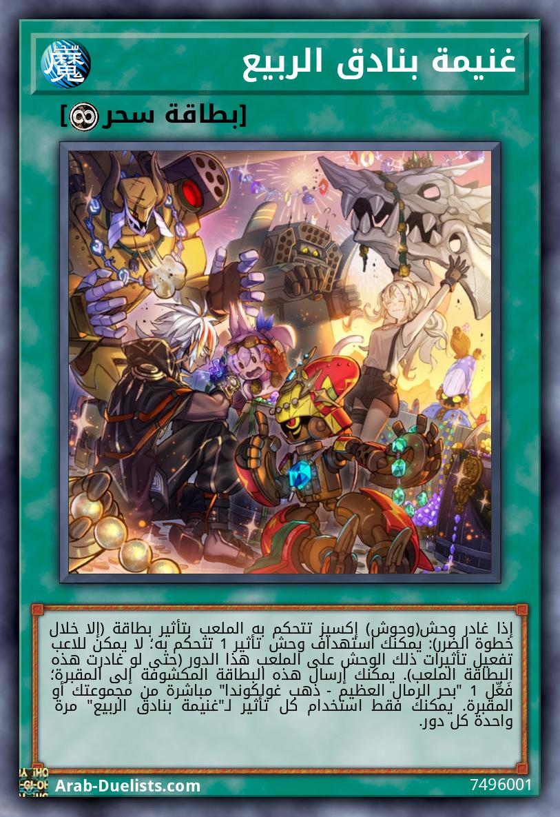 إذا غادر وحش(وحوش) إكسيز تتحكم به الملعب بتأثير بطاقة (إلا خلال خطوة الضرر): يمكنك استهداف وحش تأثير 1 تتحكم به؛ لا يمكن للاعب تفعيل تأثيرات ذلك الوحش على الملعب هذا الدور (حتى لو غادرت هذه البطاقة الملعب). يمكنك إرسال هذه البطاقة المكشوفة إلى المقبرة؛ فَعِّل 1 "بحر الرمال العظيم - ذهب غولكوندا" مباشرة من مجموعتك أو المقبرة. يمكنك فقط استخدام كل تأثير لـ"غنيمة بنادق الربيع" مرة واحدة كل دور.