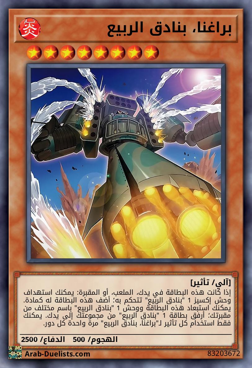 إذا كانت هذه البطاقة في يدك، الملعب، أو المقبرة: يمكنك استهداف وحش إكسيز 1 "بنادق الربيع" تتحكم به؛ أضف هذه البطاقة له كمادة. يمكنك استبعاد هذه البطاقة ووحش 1 "بنادق الربيع" باسم مختلف من مقبرتك؛ أرفق بطاقة 1 "بنادق الربيع" من مجموعتك إلى يدك. يمكنك فقط استخدام كل تأثير لـ"براغنا، بنادق الربيع" مرة واحدة كل دور.