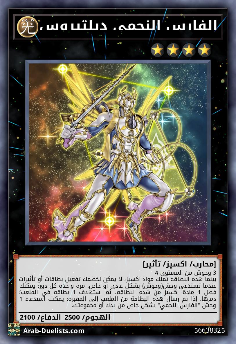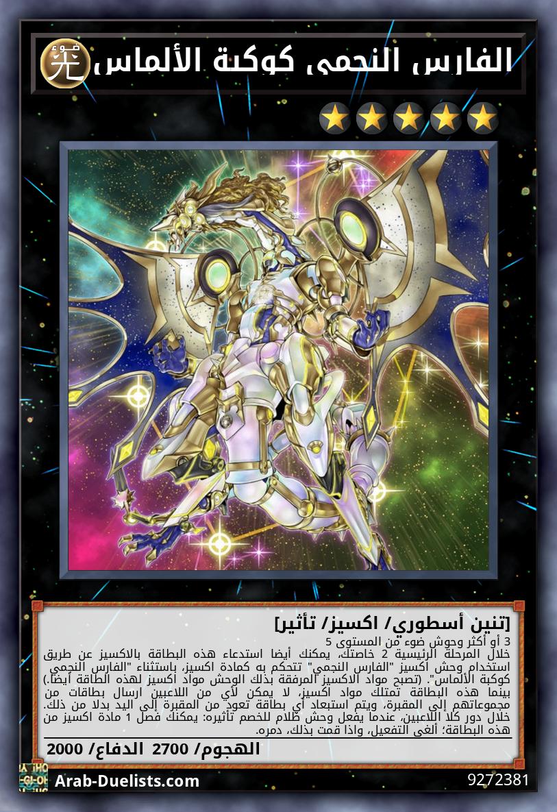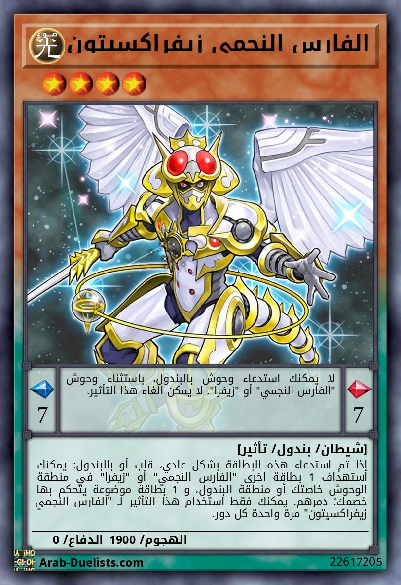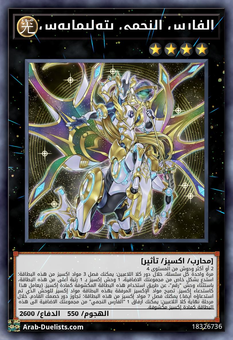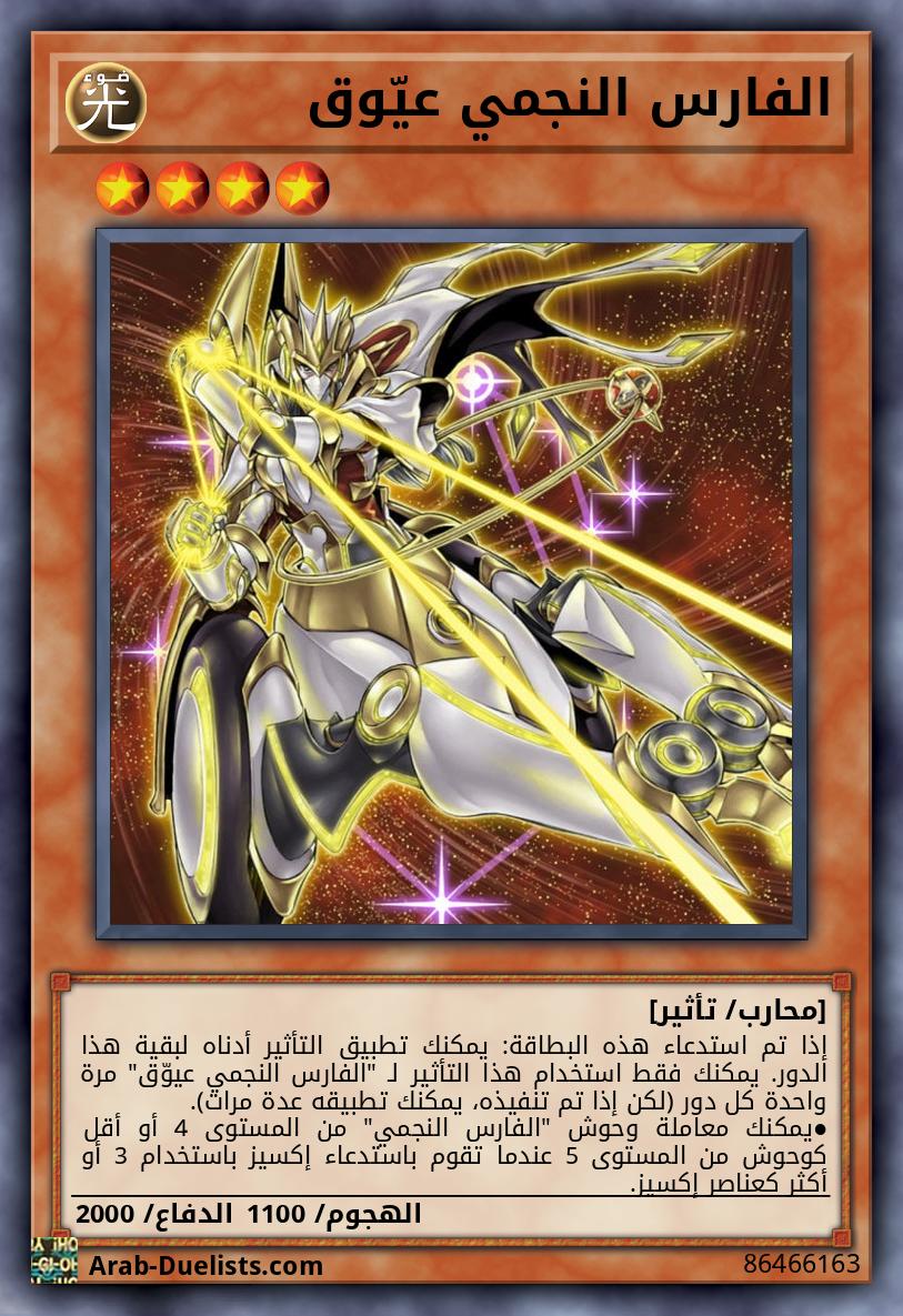 3 وحوش "الفارس النحمي" من المستوى 4 خلال الدور الذي استدعيت فيه هذه البطاقة بالاكسيز، لا يمكنك استدعاء وحوش بشكل خاص، باستثناء وحوش "الفارس النجمي". إذا تم استدعاء هذه البطاقة بالاكسيز: أرجع كل البطاقات الاخرى لتي في الملعب إلى اليد. مرة واحدة كل دور: يمكنك فصل 1 مادة اكسيز من هذه البطاقة؛ أرسل 1 بطاقة عشوائية من يد خصمك إلى المقبرة. إذا تم ارسال هذه البطاقة مع مواد الاكسيز إلى المقبرة: يمكنك استهداف 1 وحش "الفارس النجمي" في مقبرتك؛ استدعه بشكل خاص.