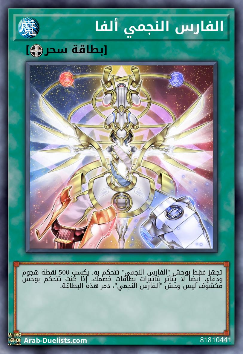 تجهز فقط بوحش "الفارس النجمي" تتحكم به. يكسب 500 نقطة هجوم ودفاع، أيضا لا يتأثر بتأثيرات بطاقات خصمك. إذا كنت تتحكم بوحش مكشوف ليس وحش "الفارس النجمي"، دمر هذه البطاقة.