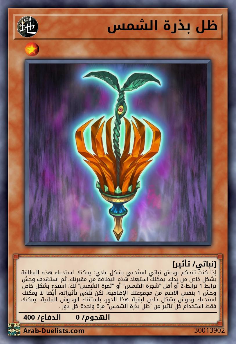 إذا كنت تتحكم بوحش نباتي استُدعيَ بشكل عادي: يمكنك استدعاء هذه البطاقة بشكل خاص من يدك. يمكنك استبعاد هذه البطاقة من مقبرتك، ثم استهدف وحش ترابط 1 ترابط-2 أو أقل "شجرة الشمس" أو "ثمرة الشمس" لك؛ استدعِ بشكل خاص وحش 1 بنفس الاسم من مجموعتك الإضافية، لكن تُلغى تأثيراته، أيضا لا يمكنك استدعاء وحوش بشكل خاص لبقية هذا الدور، باستثناء الوحوش النباتية. يمكنك فقط استخدام كل تأثير من "ظل بذرة الشمس" مرة واحدة كل دور .