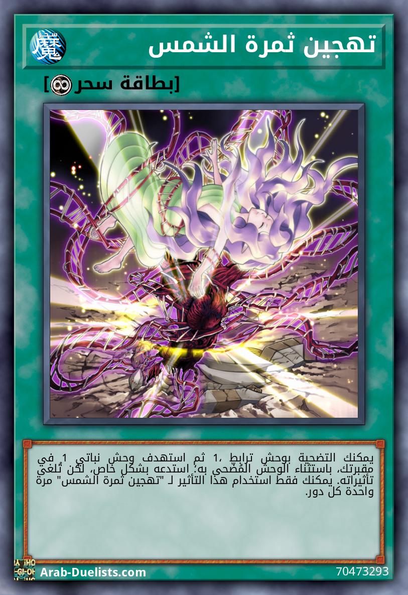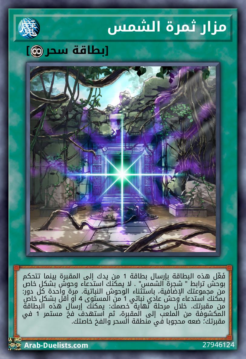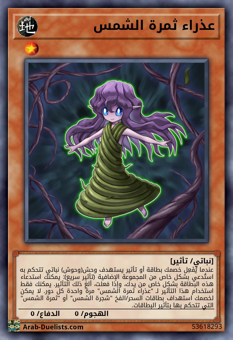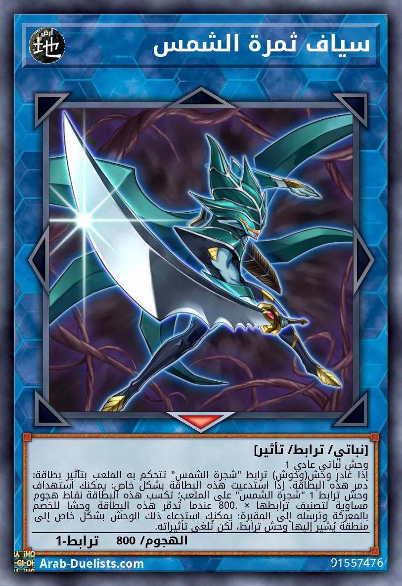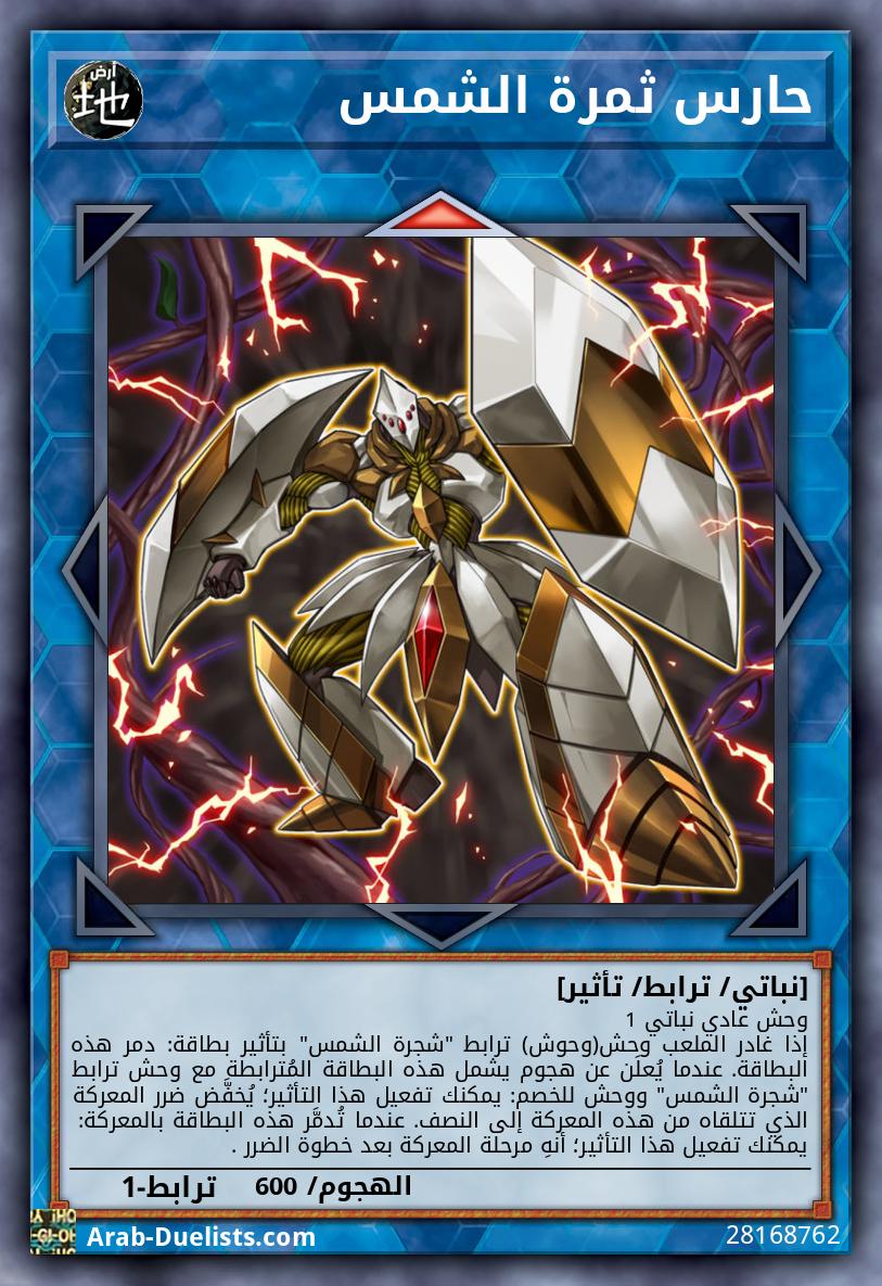 وحش عادي نباتي 1 إذا غادر وحش(وحوش) ترابط "شجرة الشمس" تتحكم به الملعب بتأثير بطاقة: دمر هذه البطاقة. إذا استُدعيت هذه البطاقة بشكل خاص: يمكنك استهداف وحش ترابط 1 "شجرة الشمس" على الملعب؛ اكسب نقاط حياة مُساوية لتصنيف ترابطه × 300. عندما يلحق وحش ترابط نباتي لك ضرر معركة بخصمك: يمكنك كسب 600 نقطة حياة .