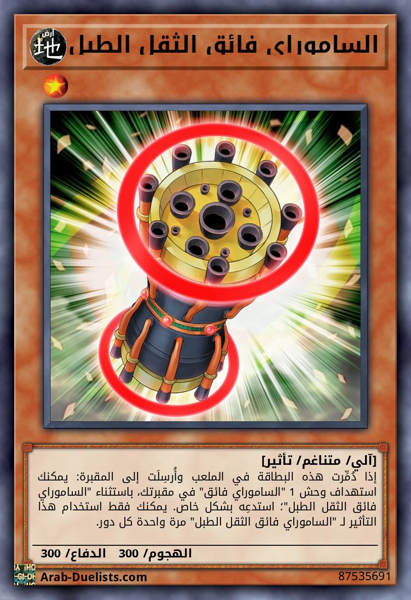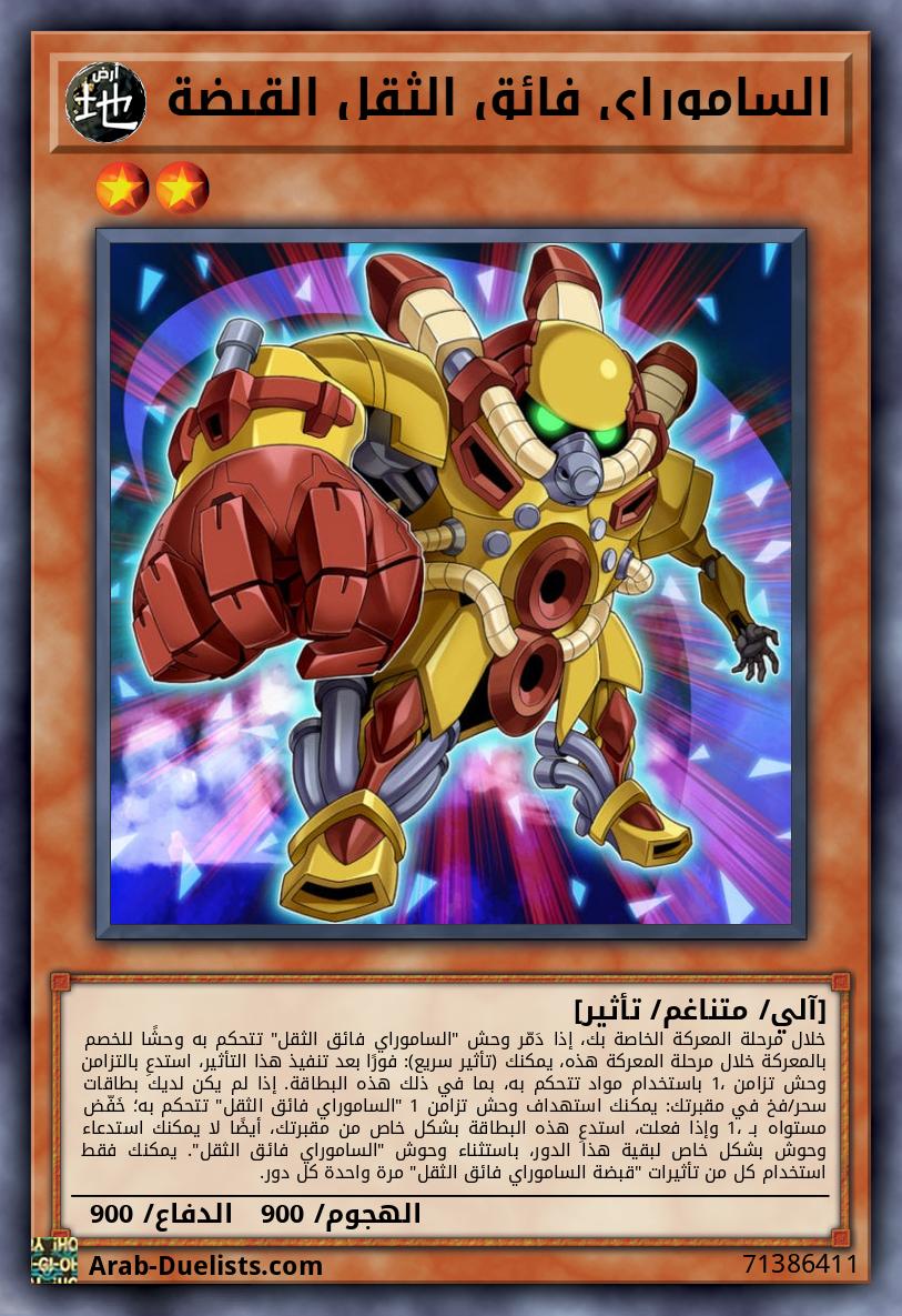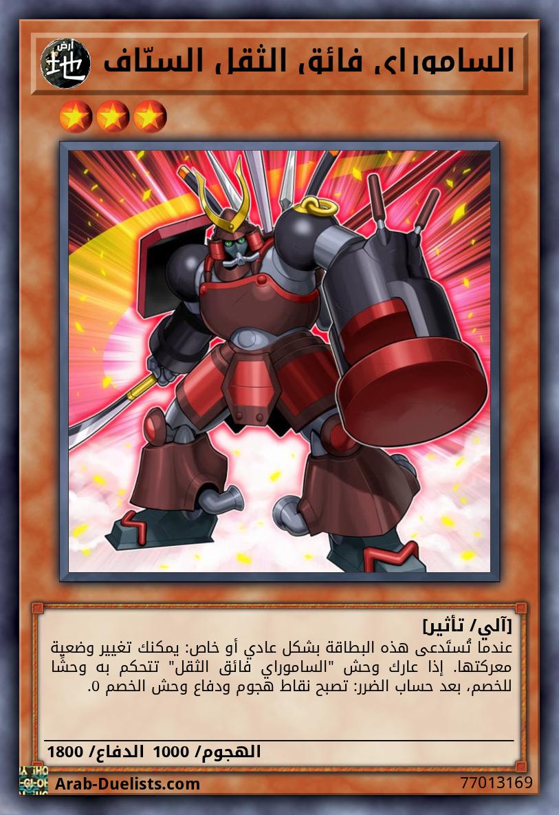 وحش متناغم 1 + وحش غير متناغم 1 "الساموراي فائق الثقل" أو أكثر يمكن لهذه البطاقة الهجوم بينما هي في وضعية الدفاع. إذا فعلت، طبّق نقاط دفاعها لحساب الضرر. إذا لم يكن لديك بطاقات سحر/فخ في مقبرتك، تكسب هذه البطاقة 900 نقطة دفاع لكل يتحكم به خصمك استُدعِيَ بشكل خاص.