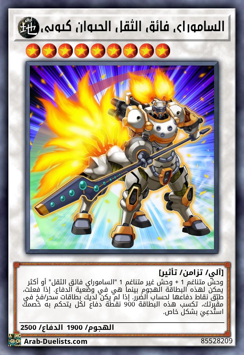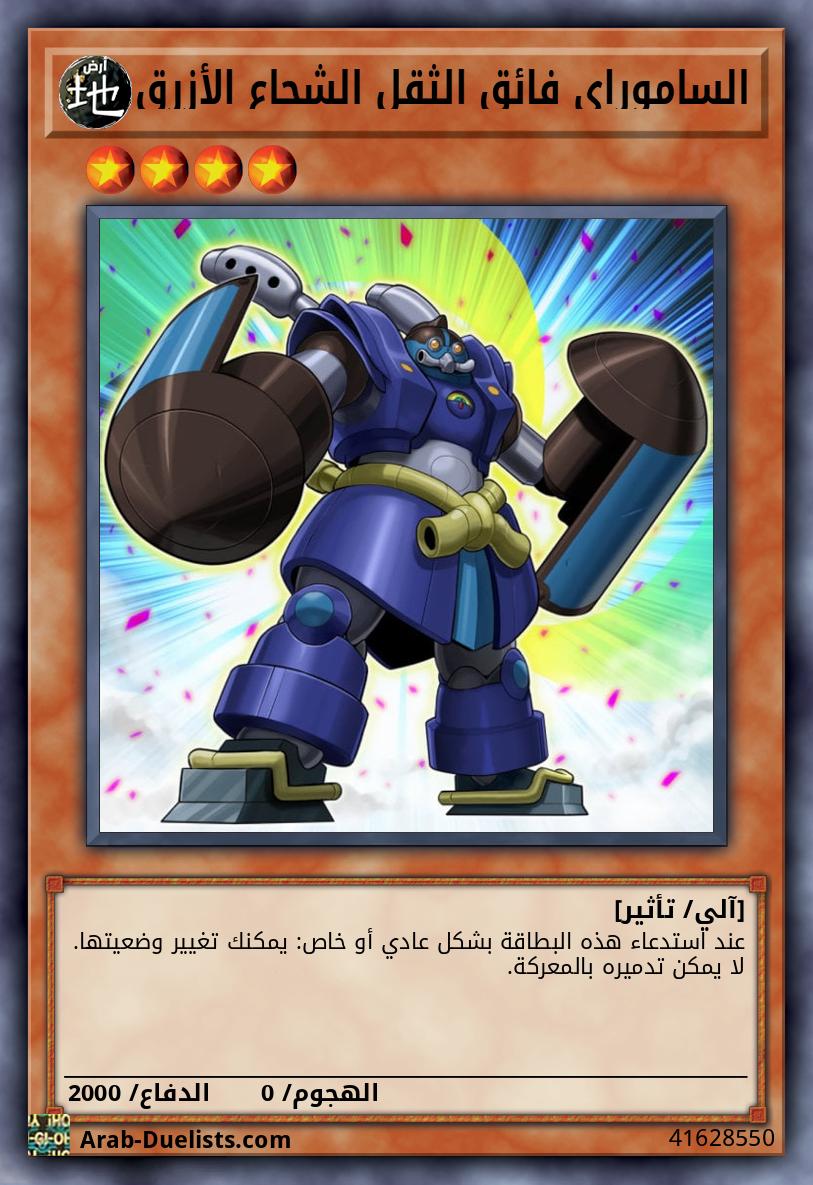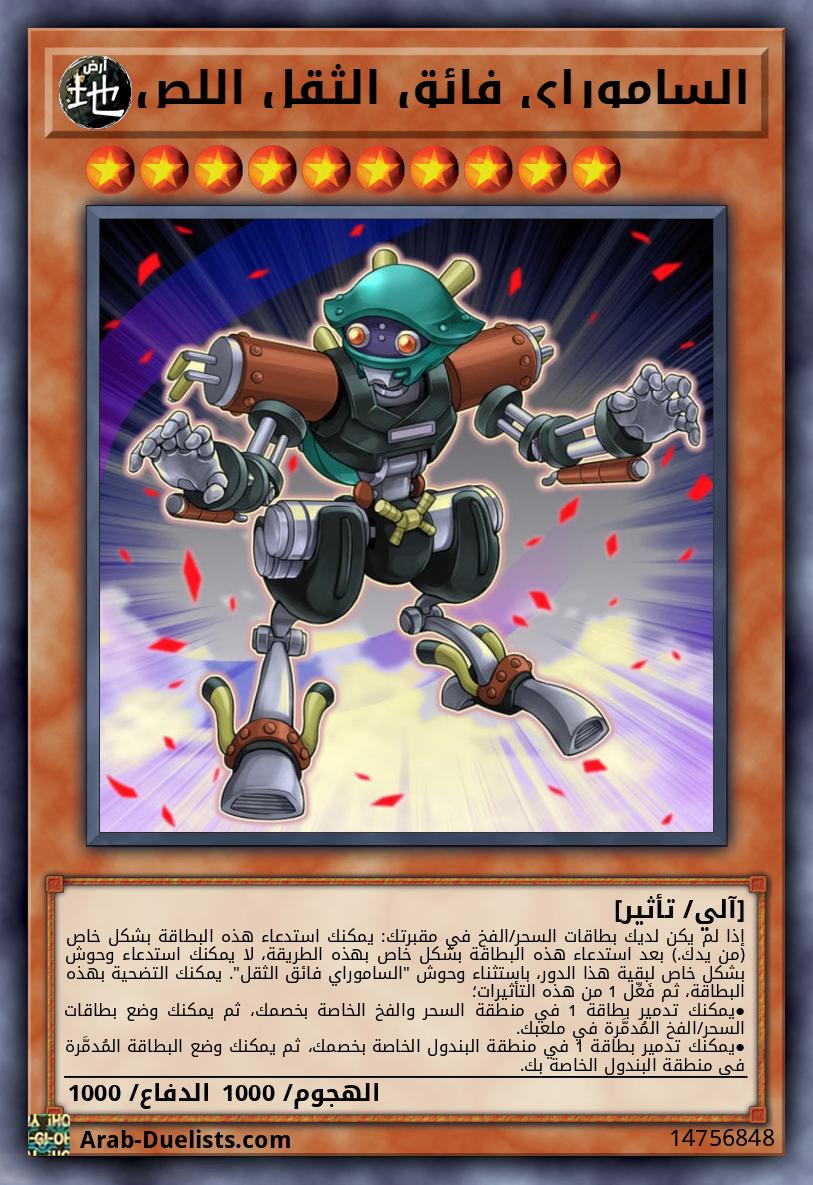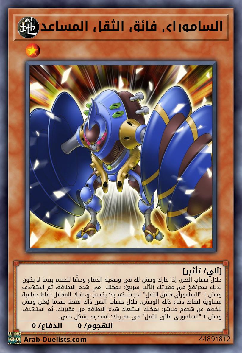 وحش متناغم 1 + وحش غير متناغم 1 "الساموراي فائق الثقل" أو أكثر يمكن لهذه البطاقة الهجوم بينما هي في وضعية الدفاع. إذا فعلت، طبّق نقاط دفاعها لحساب الضرر. إذا لم يكن لديك بطاقات سحر/فخ في مقبرتك، تكسب هذه البطاقة 900 نقطة دفاع لكل يتحكم به خصمك استُدعِيَ بشكل خاص.