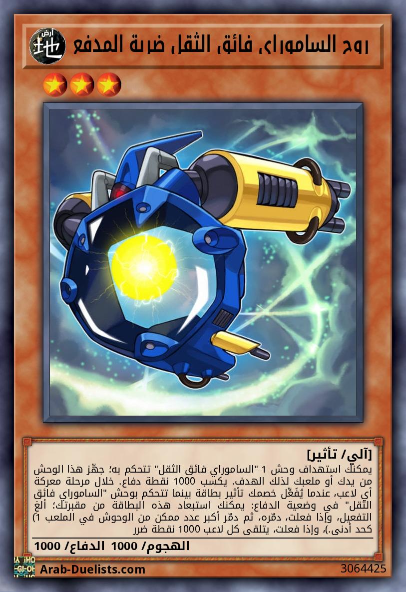 يمكنك استهداف وحش 1 "الساموراي فائق الثقل" تتحكم به؛ جهّز هذا الوحش من يدك أو ملعبك لذلك الهدف. يكسب 1000 نقطة دفاع. خلال مرحلة معركة أي لاعب، عندما يُفَعِّل خصمك تأثير بطاقة بينما تتحكم بوحش "الساموراي فائق الثقل" في وضعية الدفاع: يمكنك استبعاد هذه البطاقة من مقبرتك؛ ألغِ التفعيل، وإذا فعلت، دمّره، ثم دمّر أكبر عدد ممكن من الوحوش في الملعب (1 كحد أدنى.)، وإذا فعلت، يتلقى كل لاعب 1000 نقطة ضرر