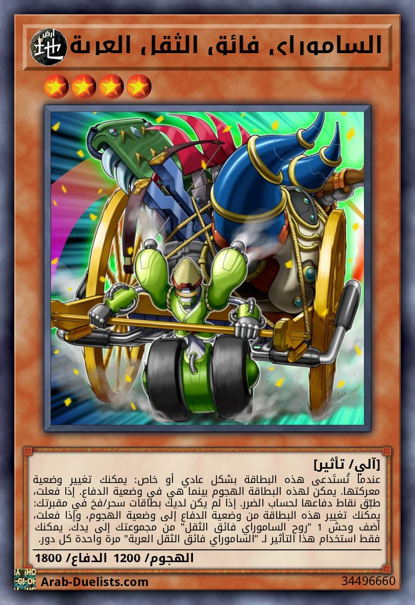 عندما تُستَدعى هذه البطاقة بشكل عادي أو خاص: يمكنك تغيير وضعية معركتها. يمكن لهذه البطاقة الهجوم بينما هي في وضعية الدفاع. إذا فعلت، طبّق نقاط دفاعها لحساب الضرر. إذا لم يكن لديك بطاقات سحر/فخ في مقبرتك: يمكنك تغيير هذه البطاقة من وضعية الدفاع إلى وضعية الهجوم، وإذا فعلت، أضف وحش 1 "روح الساموراي فائق الثقل" من مجموعتك إلى يدك. يمكنك فقط استخدام هذا التأثير لـ "الساموراي فائق الثقل العربة" مرة واحدة كل دور.