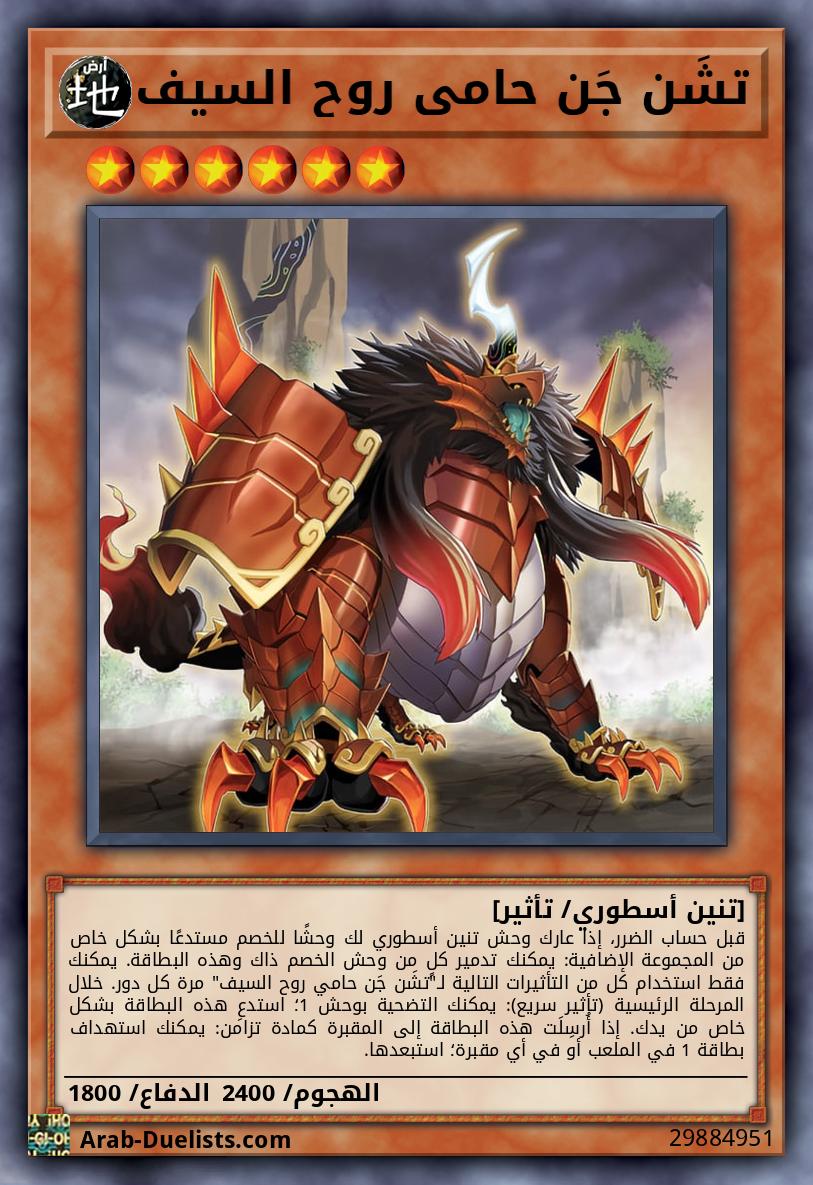 قبل حساب الضرر، إذا عارك وحش تنين أسطوري لك وحشًا للخصم مستدعًا بشكل خاص من المجموعة الإضافية: يمكنك تدمير كلٍ من وحش الخصم ذاك وهذه البطاقة. يمكنك فقط استخدام كل من التأثيرات التالية لـ"تشَن جَن حامي روح السيف" مرة كل دور. خلال المرحلة الرئيسية (تأثير سريع): يمكنك التضحية بوحش 1؛ استدعِ هذه البطاقة بشكل خاص من يدك. إذا أُرسِلَت هذه البطاقة إلى المقبرة كمادة تزامن: يمكنك استهداف بطاقة 1 في الملعب أو في أي مقبرة؛ استبعدها.