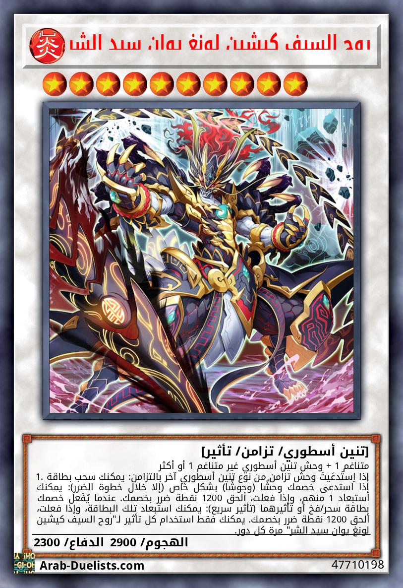 متناغم 1 + وحش تنين أسطوري غير متناغم 1 أو أكثر إذا اِستَدعَيتَ وحش تزامن من نوع تنين أسطوري آخر بالتزامن: يمكنك سحب بطاقة 1. إذا استدعى خصمك وحشًا (وحوشًا) بشكل خاص (إلا خلال خطوة الضرر): يمكنك استبعاد 1 منهم، وإذا فعلت، ألحق 1200 نقطة ضرر بخصمك. عندما يُفَعل خصمك بطاقة سحر/فخ أو تأثيرهما (تأثير سريع): يمكنك استبعاد تلك البطاقة، وإذا فعلت، ألحق 1200 نقطة ضرر بخصمك. يمكنك فقط استخدام كل تأثير لـ"روح السيف كيشين لونغ يوان سيد الشر" مرة كل دور.