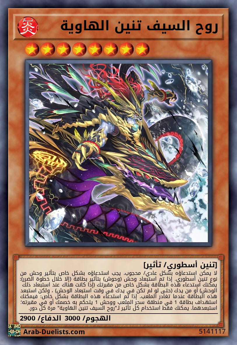 لا يمكن استدعاؤه بشكل عادي/ محجوب. يجب استدعاؤه بشكل خاص بتأثير وحش من نوع تنين أسطوري. إذا تم استبعاد وحش (وحوش) بتأثير بطاقة (إلا خلال خطوة الضرر): يمكنك استدعاء هذه البطاقة بشكل خاص من مقبرتك (إذا كانت هناك عند استبعاد ذلك الوحش) أو من يدك (حتى لو لم تكن في يدك في وقت استبعاد الوحش) ، ولكن استبعد هذه البطاقة عندما تغادر الملعب. إذا تم استدعاء هذه البطاقة بشكل خاص: فيمكنك استهداف بطاقة 1 في منطقة سحر الملعب ووحش 1 يتحكم به خصمك أو في مقبرته؛ استبعدهما. يمكنك فقط استخدام كل تأثير لـ"روح السيف تنين الهاوية" مرة كل دور.