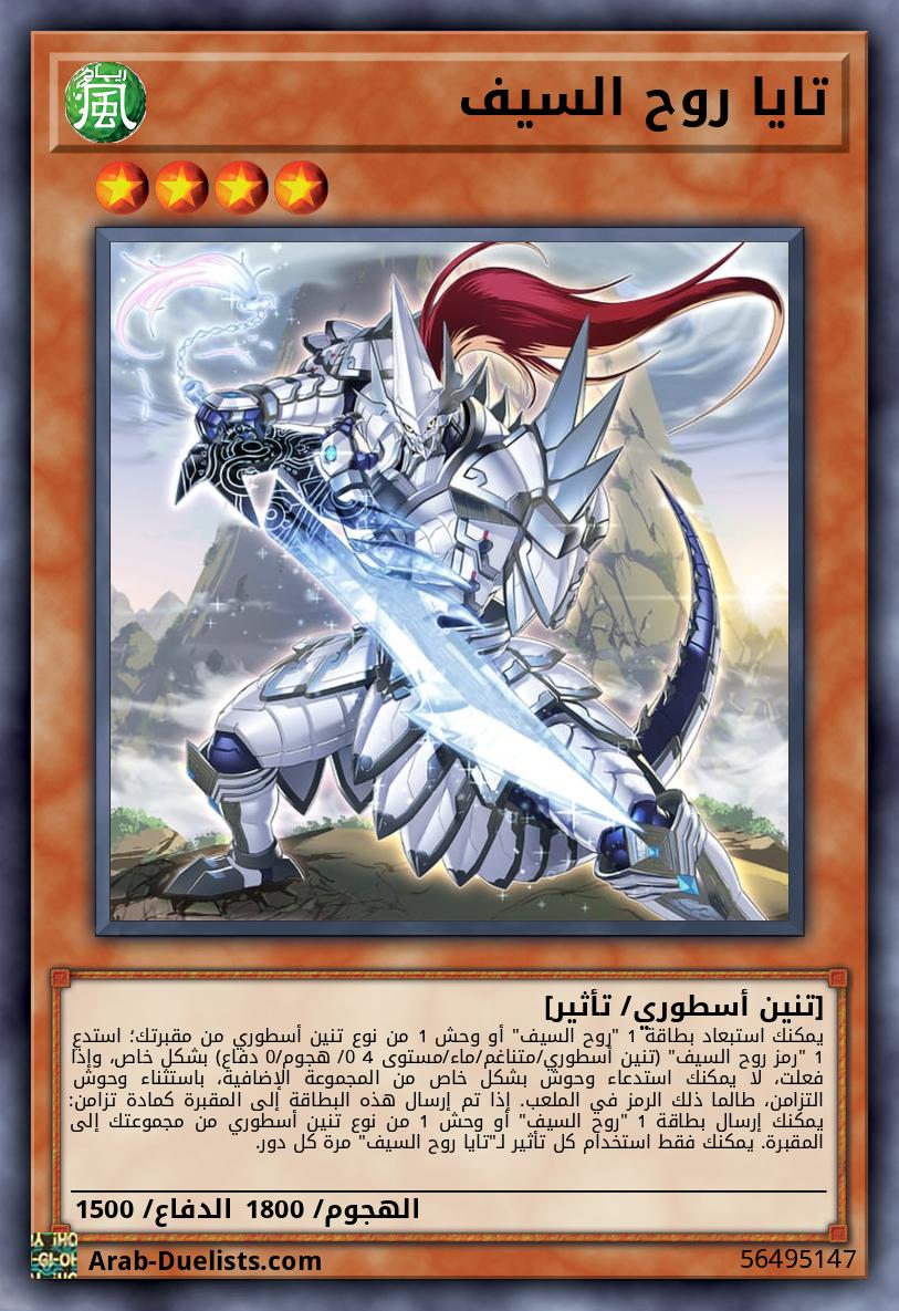 يمكنك استبعاد بطاقة 1 "روح السيف" أو وحش 1 من نوع تنين أسطوري من مقبرتك؛ استدعِ 1 "رمز روح السيف" (تنين أسطوري/متناغم/ماء/مستوى 4 /0 هجوم/0 دفاع) بشكل خاص، وإذا فعلت، لا يمكنك استدعاء وحوش بشكل خاص من المجموعة الإضافية، باستثناء وحوش التزامن، طالما ذلك الرمز في الملعب. إذا تم إرسال هذه البطاقة إلى المقبرة كمادة تزامن: يمكنك إرسال بطاقة 1 "روح السيف" أو وحش 1 من نوع تنين أسطوري من مجموعتك إلى المقبرة. يمكنك فقط استخدام كل تأثير لـ"تايا روح السيف" مرة كل دور.
