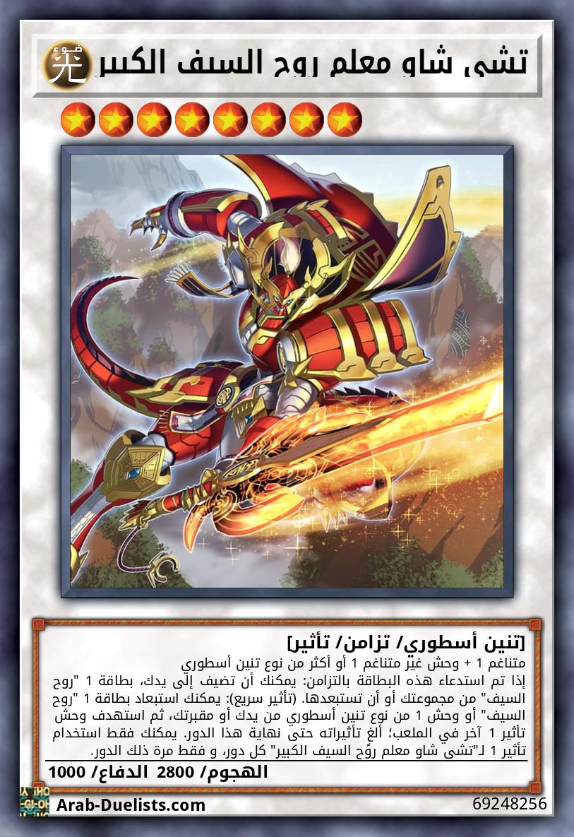 متناغم 1 + وحش غير متناغم 1 أو أكثر من نوع تنين أسطوري إذا تم استدعاء هذه البطاقة بالتزامن: يمكنك أن تضيف إلى يدك، بطاقة 1 "روح السيف" من مجموعتك أو أن تستبعدها. (تأثير سريع): يمكنك استبعاد بطاقة 1 "روح السيف" أو وحش 1 من نوع تنين أسطوري من يدك أو مقبرتك، ثم استهدف وحش تأثير 1 آخر في الملعب؛ ألغٍ تأثيراته حتى نهاية هذا الدور. يمكنك فقط استخدام تأثير 1 لـ"تشي شاو معلم روح السيف الكبير" كل دور، و فقط مرة ذلك الدور.