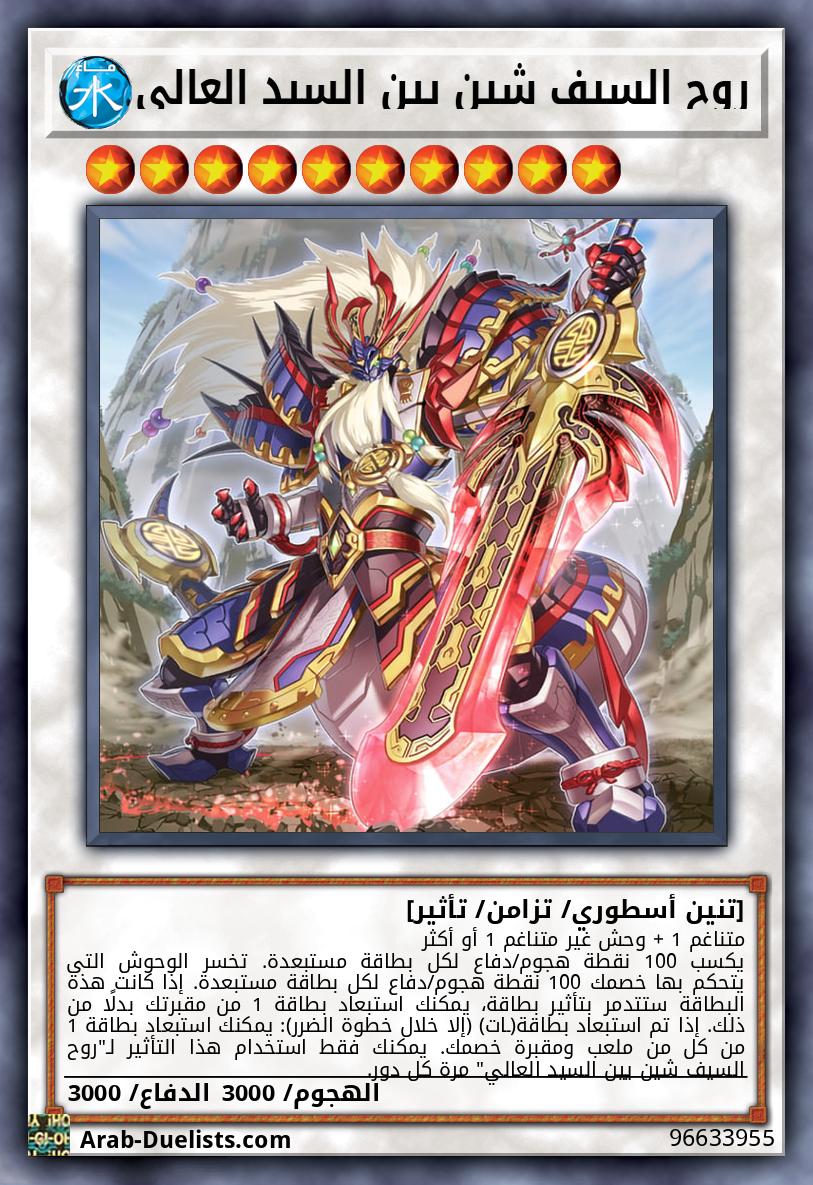 متناغم 1 + وحش غير متناغم 1 أو أكثر يكسب 100 نقطة هجوم/دفاع لكل بطاقة مستبعدة. تخسر الوحوش التي يتحكم بها خصمك 100 نقطة هجوم/دفاع لكل بطاقة مستبعدة. إذا كانت هذه البطاقة ستتدمر بتأثير بطاقة، يمكنك استبعاد بطاقة 1 من مقبرتك بدلًا من ذلك. إذا تم استبعاد بطاقة(ـات) (إلا خلال خطوة الضرر): يمكنك استبعاد بطاقة 1 من كل من ملعب ومقبرة خصمك. يمكنك فقط استخدام هذا التأثير لـ"روح السيف شين يين السيد العالي" مرة كل دور.