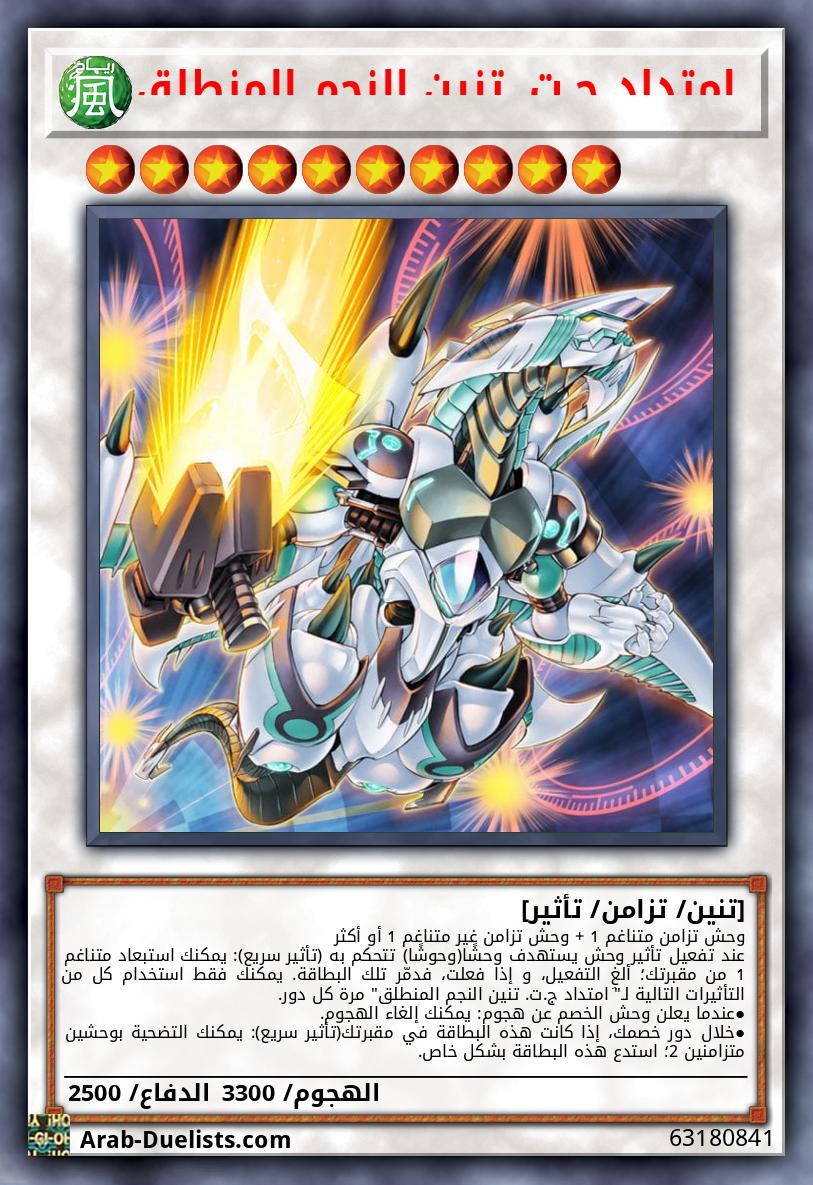 وحش تزامن متناغم 1 + وحش تزامن غير متناغم 1 أو أكثر عند تفعيل تأثير وحش يستهدف وحشًا(وحوشًا) تتحكم به (تأثير سريع): يمكنك استبعاد متناغم 1 من مقبرتك؛ ألغِ التفعيل، و إذا فعلت، فدمّر تلك البطاقة. يمكنك فقط استخدام كل من التأثيرات التالية لـ" امتداد ج.ت. تنين النجم المنطلق" مرة كل دور. ●عندما يعلن وحش الخصم عن هجوم: يمكنك إلغاء الهجوم. ●خلال دور خصمك، إذا كانت هذه البطاقة في مقبرتك(تأثير سريع): يمكنك التضحية بوحشين متزامنين 2؛ استدع هذه البطاقة بشكل خاص.