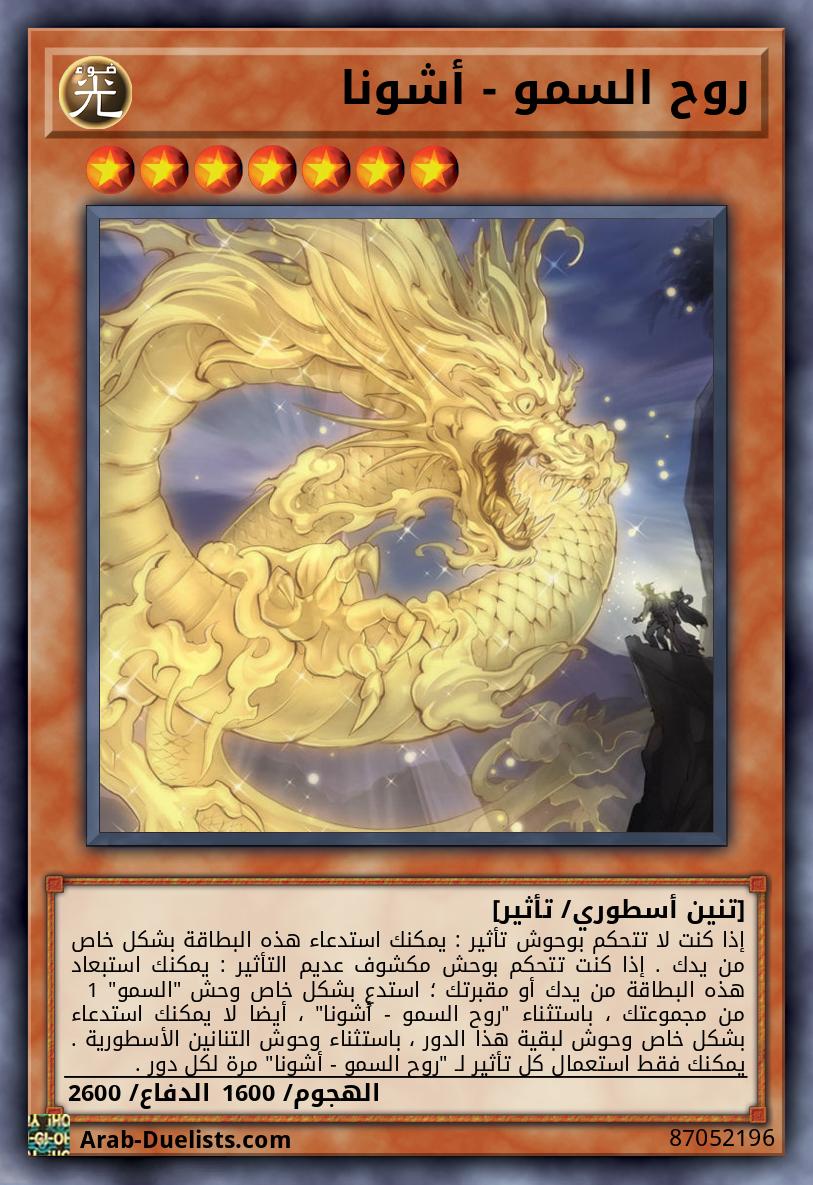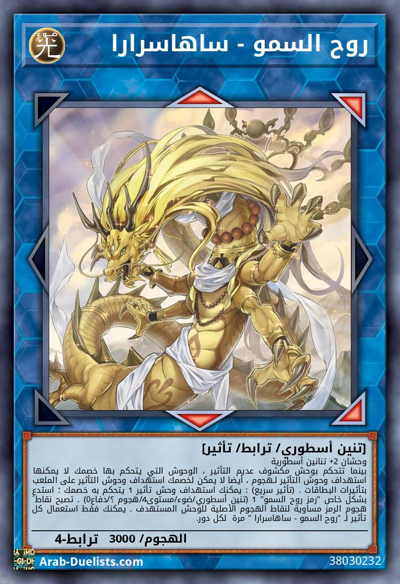 وحشان 2+ تنانين أسطورية بينما تتحكم بوحش مكشوف عديم التأثير ، الوحوش التي يتحكم بها خصمك لا يمكنها استهداف وحوش التأثير لـهجوم ، أيضا لا يمكن لخصمك استهداف وحوش التأثير على الملعب بتأثيرات البطاقات . (تأثير سريع) : يمكنك استهداف وحش تأثير 1 يتحكم به خصمك ؛ استدعِ بشكل خاص "رمز روح السمو" 1 (تنين أسطوري/ضوء/مستوى4/هجوم ؟/دفاع0) . تصبح نقاط هجوم الرمز مساوية لنقاط الهجوم الأصلية للوحش المستهدف . يمكنك فقط استعمال كل تأثير لـ "روح السمو - ساهاسرارا " مرة لكل دور.