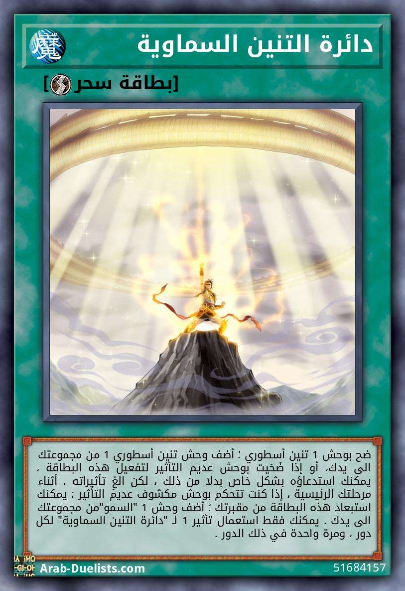 ضح بوحش 1 تنين أسطوري ؛ أضف وحش تنين أسطوري 1 من مجموعتك الى يدك، أو إذا ضَحَيت بوحش عديم التأثير لتفعيل هذه البطاقة ، يمكنك استدعاؤه بشكل خاص بدلا من ذلك ، لكن الغِ تأثيراته . أثناء مرحلتك الرئيسية ، إذا كنت تتحكم بوحش مكشوف عديم التأثير : يمكنك استبعاد هذه البطاقة من مقبرتك ؛ أضف وحش 1 "السمو"من مجموعتك الى يدك . يمكنك فقط استعمال تأثير 1 لـ "دائرة التنين السماوية" لكل دور ، ومرة واحدة في ذلك الدور .