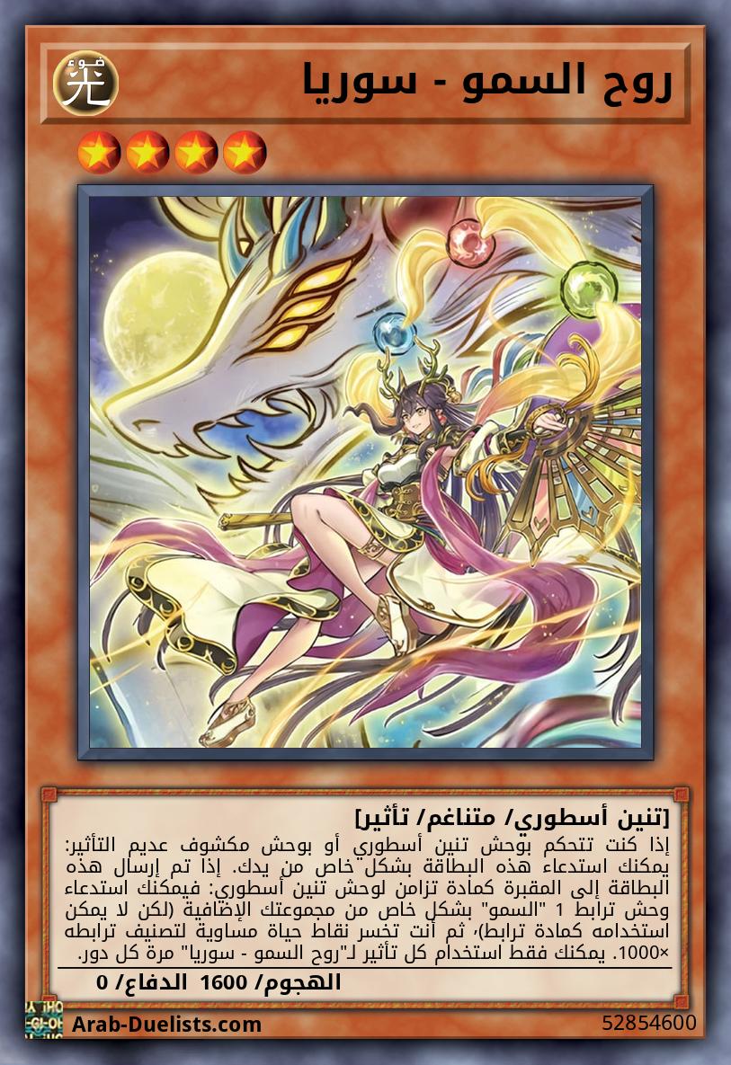 إذا كنت تتحكم بوحش تنين أسطوري أو بوحش مكشوف عديم التأثير: يمكنك استدعاء هذه البطاقة بشكل خاص من يدك. إذا تم إرسال هذه البطاقة إلى المقبرة كمادة تزامن لوحش تنين أسطوري: فيمكنك استدعاء وحش ترابط 1 "السمو" بشكل خاص من مجموعتك الإضافية (لكن لا يمكن استخدامه كمادة ترابط)٬ ثم أنت تخسر نقاط حياة مساوية لتصنيف ترابطه ×1000. يمكنك فقط استخدام كل تأثير لـ"روح السمو - سوريا" مرة كل دور.