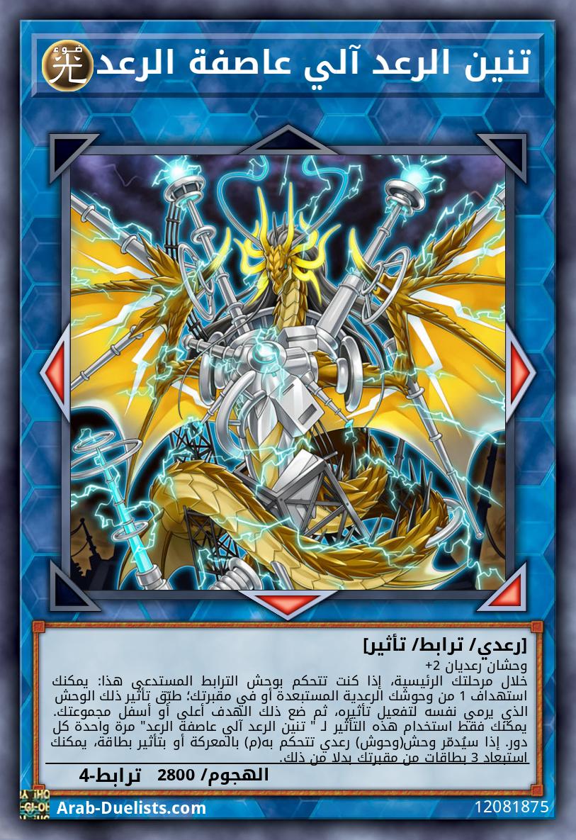 وحشان رعديان 2+ خلال مرحلتك الرئيسية، إذا كنت تتحكم بوحش الترابط المستدعى هذا: يمكنك استهداف 1 من وحوشك الرعدية المستبعدة أو في مقبرتك؛ طبّق تأثير ذلك الوحش الذي يرمي نفسه لتفعيل تأثيره، ثم ضع ذلك الهدف أعلى أو أسفل مجموعتك. يمكنك فقط استخدام هذه التأثير لـ " تنين الرعد آلي عاصفة الرعد" مرة واحدة كل دور. إذا سيُدمّر وحش(وحوش) رعدي تتحكم به(م) بالمعركة أو بتأثير بطاقة، يمكنك استبعاد 3 بطاقات من مقبرتك بدلا من ذلك.