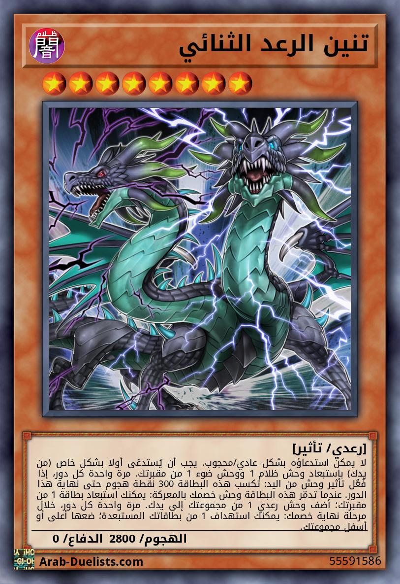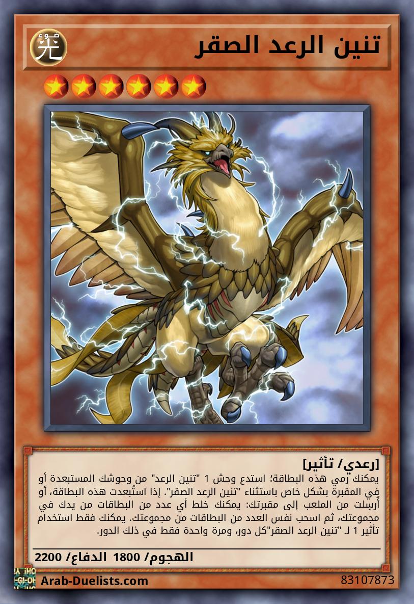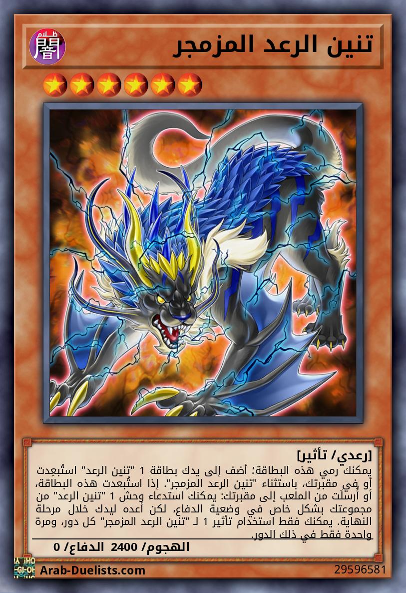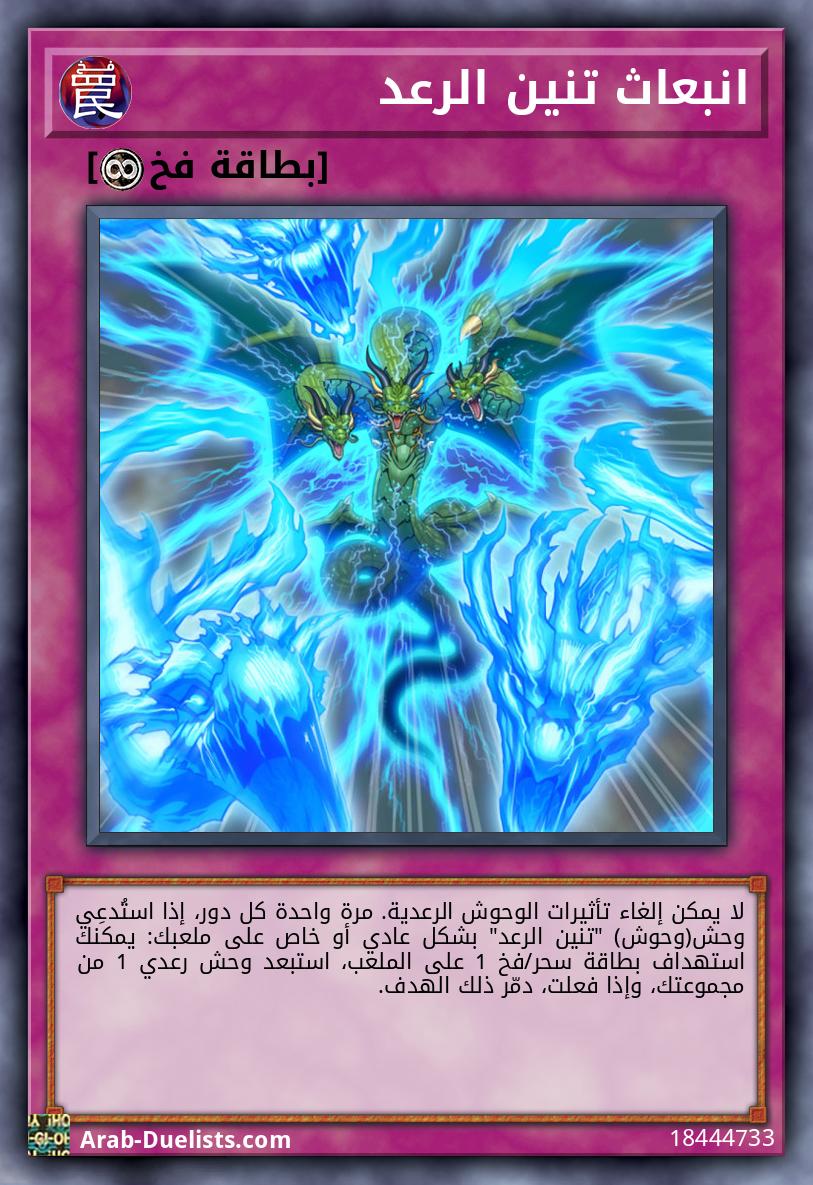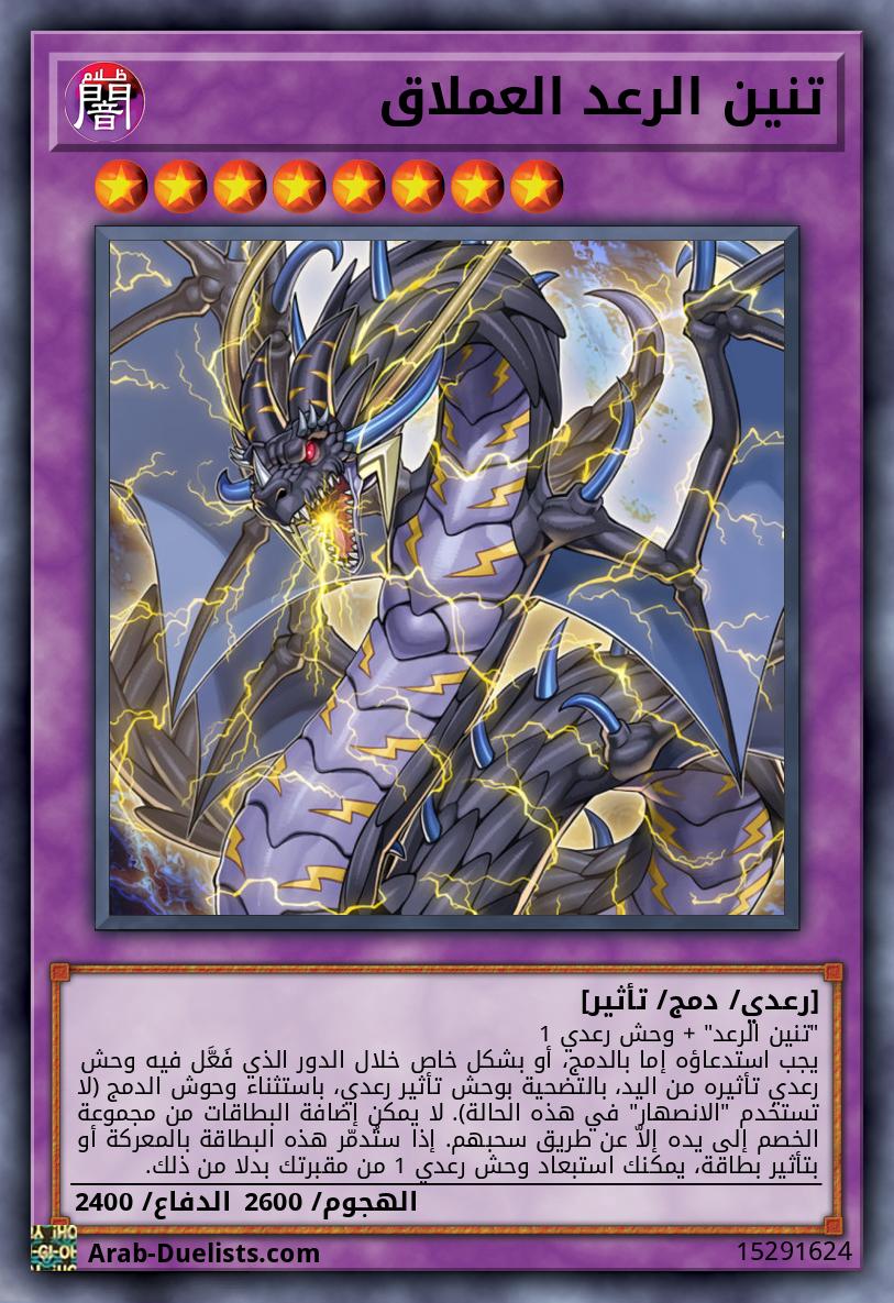 لا يمكن استدعاؤه بشكل عادي/محجوب. يجب استدعاؤه أولا بشكل خاص (من يدك) عبر استبعاد وحش رعدي 1 من المستوى 8 أو أقل من يدك أو مكشوف في ملعبك، خلال الدور الذي فَعَّل فيه وحش رعدي تأثيره من اليد. (1) مرة كل دور (تأثير سريع): يمكنك استبعاد بطاقتين 2 من مقبرتك، بما في ذلك وحش رعدي 1، ثم استهدف وحشًا رعديًا 1 تتحكم به؛ لا يمكن لخصمك استهداف ذلك الوحش بتأثيرات البطاقات هذا الدور. (2) مرة كل دور، خلال مرحلة نهايتك: يمكنك إرسال بطاقة 1 "تنين الرعد" من مجموعتك إلى مقبرتك.