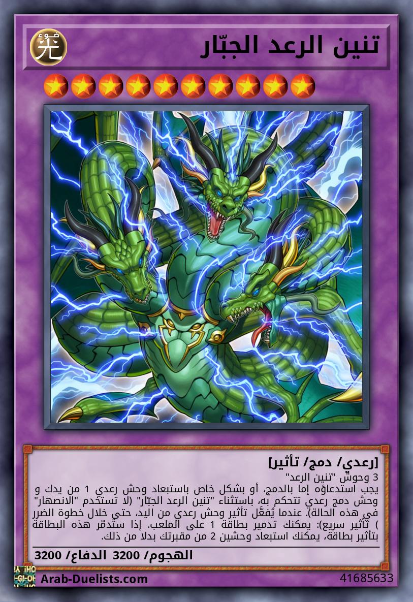 3 وحوش "تنين الرعد" يجب استدعاؤه إما بالدمج، أو بشكل خاص باستبعاد وحش رعدي 1 من يدك و وحش دمج رعدي تتحكم به، باستثناء "تنين الرعد الجبّار" (لا تستخدم "الانصهار" في هذه الحالة). عندما يُفعَّل تأثير وحش رعدي من اليد، حتى خلال خطوة الضرر ( تأثير سريع): يمكنك تدمير بطاقة 1 على الملعب. إذا ستُدمّر هذه البطاقة بتأثير بطاقة، يمكنك استبعاد وحشين 2 من مقبرتك بدلا من ذلك.