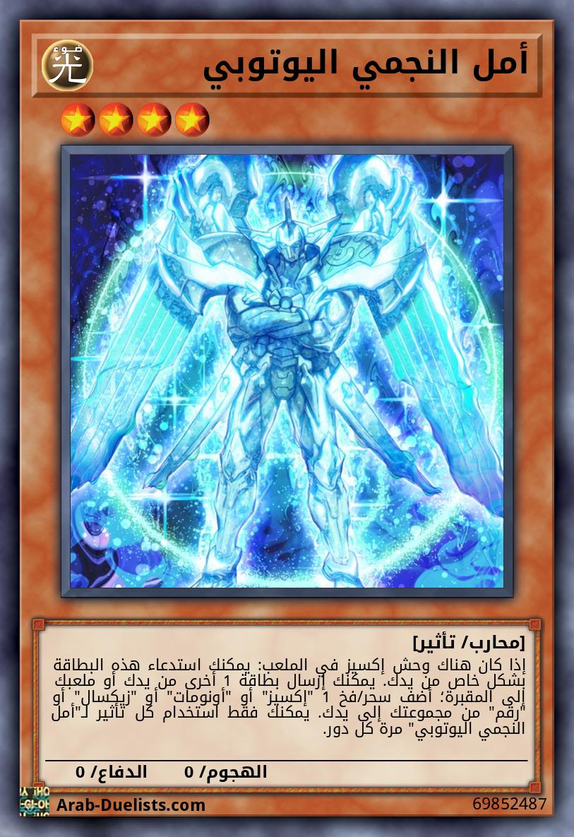 إذا كان هناك وحش إكسيز في الملعب: يمكنك استدعاء هذه البطاقة بشكل خاص من يدك. يمكنك إرسال بطاقة 1 أخرى من يدك أو ملعبك إلى المقبرة؛ أضف سحر/فخ 1 "إكسيز" أو "أونومات" أو "زيكسال" أو "رقم" من مجموعتك إلى يدك. يمكنك فقط استخدام كل تأثير لـ"أمل النجمي اليوتوبي" مرة كل دور.