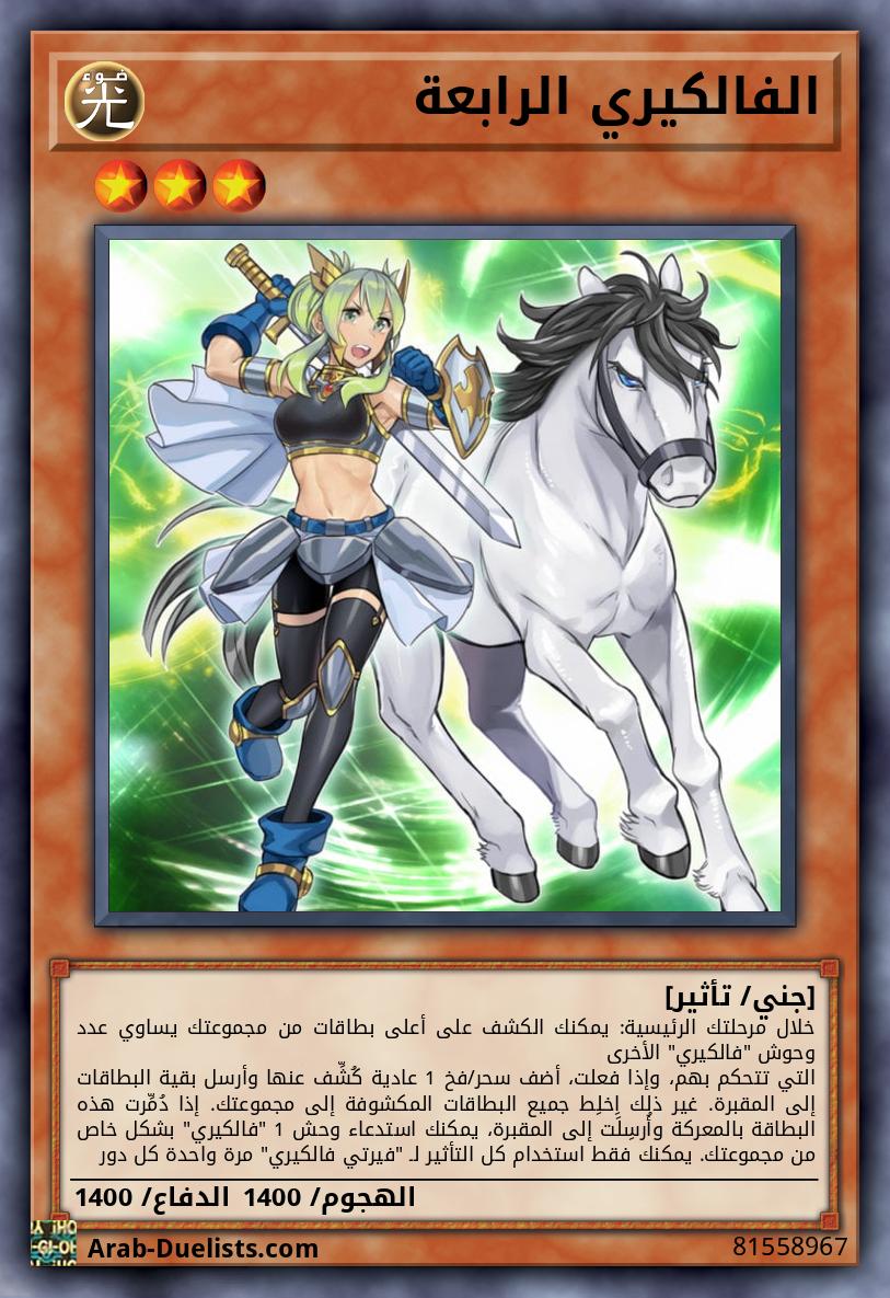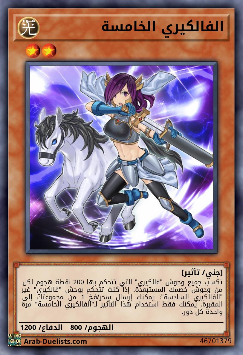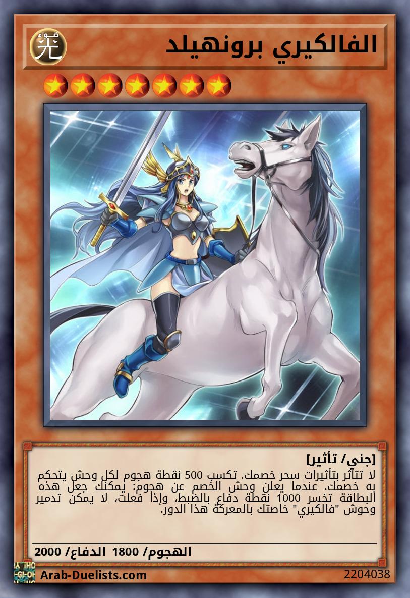 لا تتأثر بتأثيرات سحر خصمك. تكسب 500 نقطة هجوم لكل وحش يتحكم به خصمك. عندما يعلن وحش الخصم عن هجوم: يمكنك جعل هذه البطاقة تخسر 1000 نقطة دفاع بالضبط، وإذا فعلت، لا يمكن تدمير وحوش "فالكيري" خاصتك بالمعركة هذا الدور.