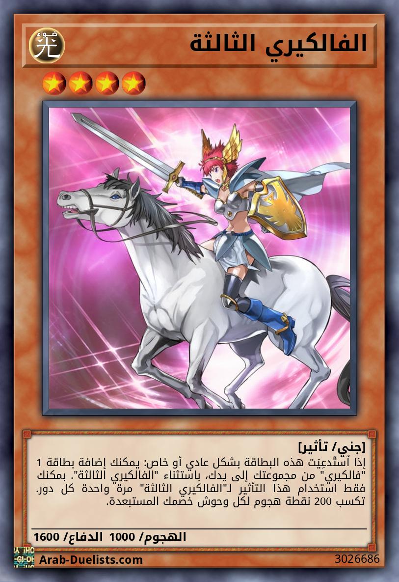 إذا اُستُدعِيَت هذه البطاقة بشكل عادي أو خاص: يمكنك إضافة بطاقة 1 "فالكيري" من مجموعتك إلى يدك، باستثناء "الفالكيري الثالثة". بمكنك فقط استخدام هذا التأثير لـ"الفالكيري الثالثة" مرة واحدة كل دور. تكسب 200 نقطة هجوم لكل وحوش خصمك المستبعدة.