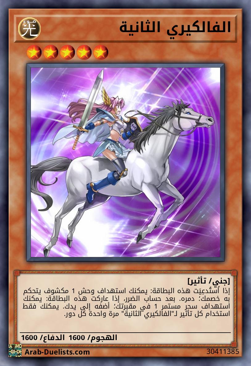 إذا اُستُدعِيَت هذه البطاقة: يمكنك استهداف وحش 1 مكشوف يتحكم به خصمك؛ دمره. بعد حساب الضرر، إذا عاركت هذه البطاقة: يمكنك استهداف سحر مستمر 1 في مقبرتك؛ أضفه إلى يدك. يمكنك فقط استخدام كل تأثير لـ"الفالكيري الثانية" مرة واحدة كل دور.