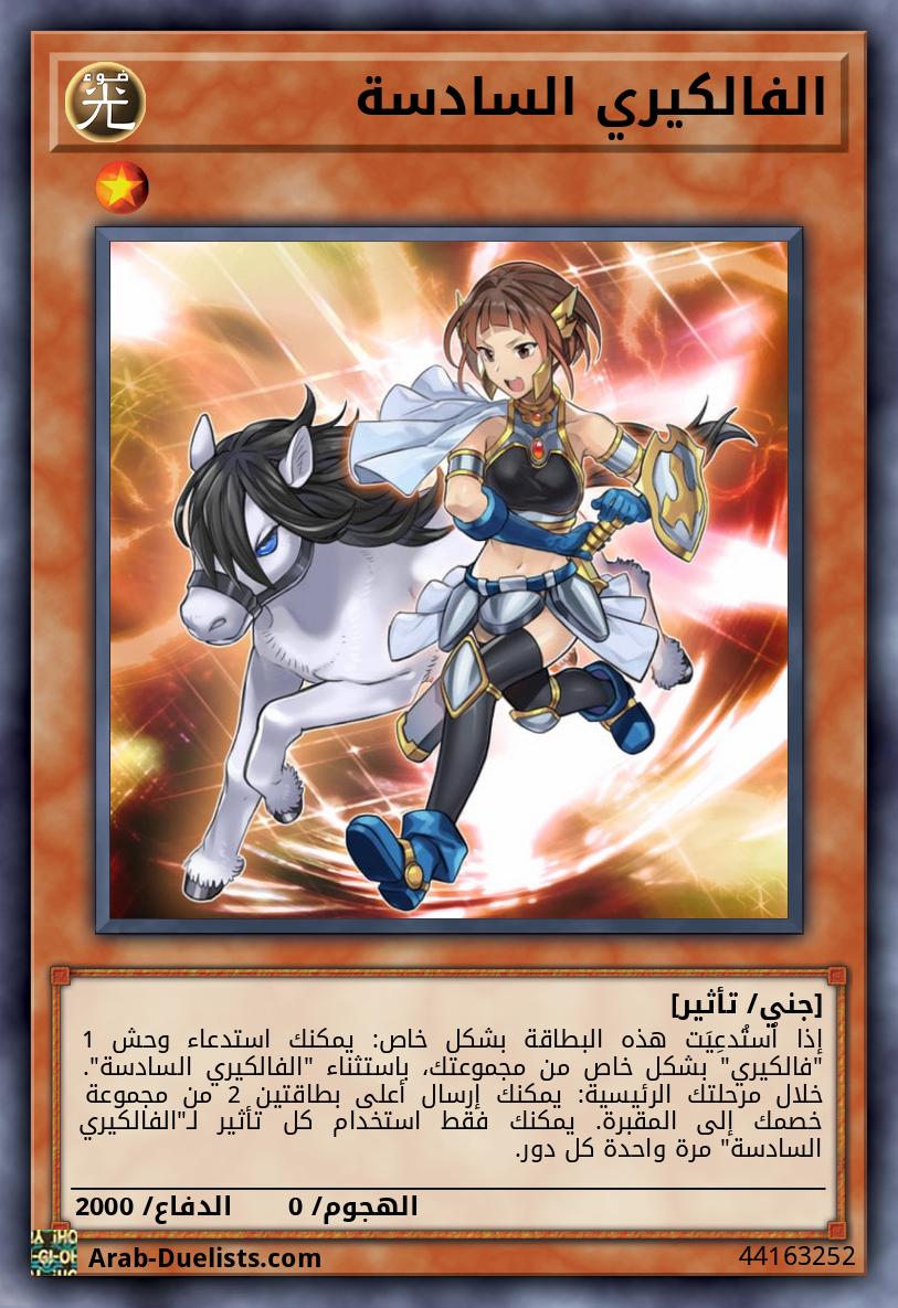 إذا اُستُدعِيَت هذه البطاقة بشكل خاص: يمكنك استدعاء وحش 1 "فالكيري" بشكل خاص من مجموعتك، باستثناء "الفالكيري السادسة". خلال مرحلتك الرئيسية: يمكنك إرسال أعلى بطاقتين 2 من مجموعة خصمك إلى المقبرة. يمكنك فقط استخدام كل تأثير لـ"الفالكيري السادسة" مرة واحدة كل دور.