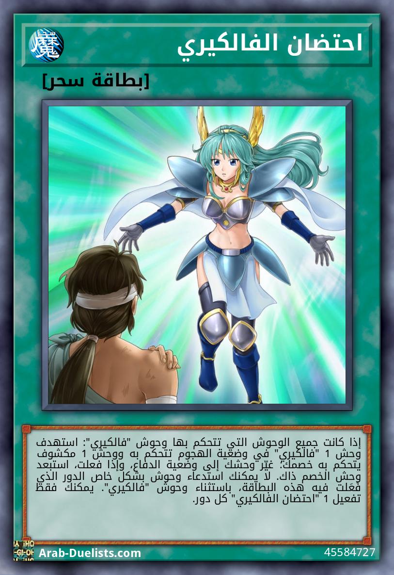 إذا كانت جميع الوحوش التي تتحكم بها وحوش "فالكيري": استهدف وحش 1 "فالكيري" في وضعية الهجوم تتحكم به ووحش 1 مكشوف يتحكم به خصمك؛ غيّر وحشك إلى وضعية الدفاع، وإذا فعلت، استبعد وحش الخصم ذاك. لا يمكنك استدعاء وحوش بشكل خاص الدور الذي فَعَلت فيه هذه البطاقة، باستثناء وحوش "فالكيري". يمكنك فقط تفعيل 1 "احتضان الفالكيري" كل دور.