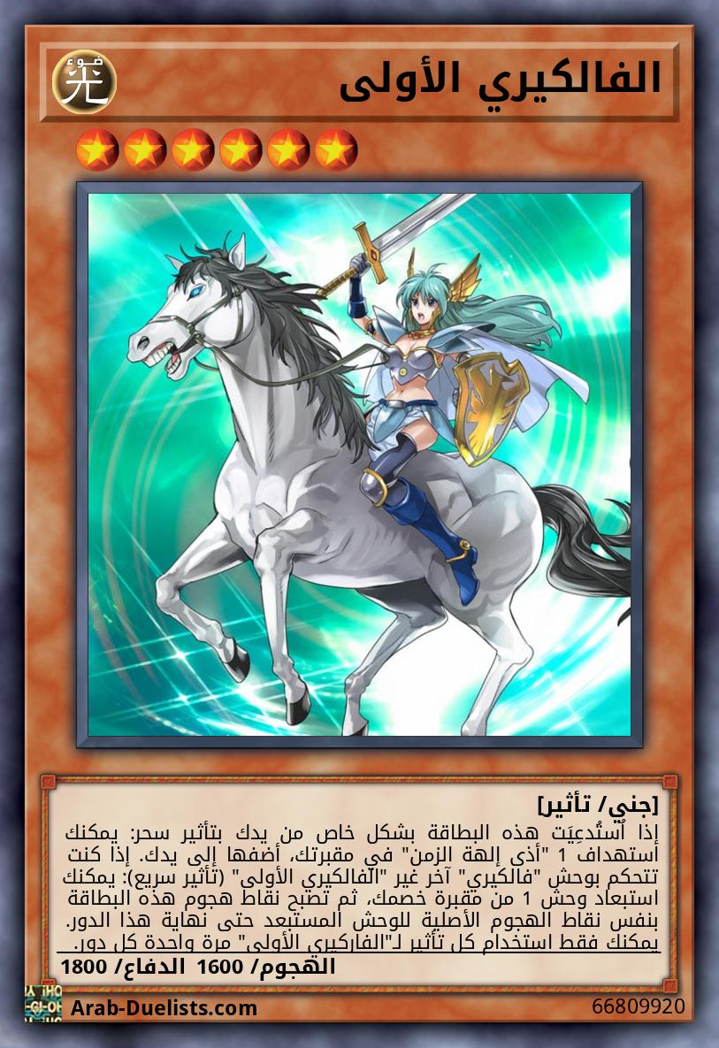 إذا اُستُدعِيَت هذه البطاقة بشكل خاص من يدك بتأثير سحر: يمكنك استهداف 1 "أذى إلهة الزمن" في مقبرتك، أضفها إلى يدك. إذا كنت تتحكم بوحش "فالكيري" آخر غير "الفالكيري الأولى" (تأثير سريع): يمكنك استبعاد وحش 1 من مقبرة خصمك، ثم تصبح نقاط هجوم هذه البطاقة بنفس نقاط الهجوم الأصلية للوحش المستبعد حتى نهاية هذا الدور. يمكنك فقط استخدام كل تأثير لـ"الفاركيري الأولى" مرة واحدة كل دور.
