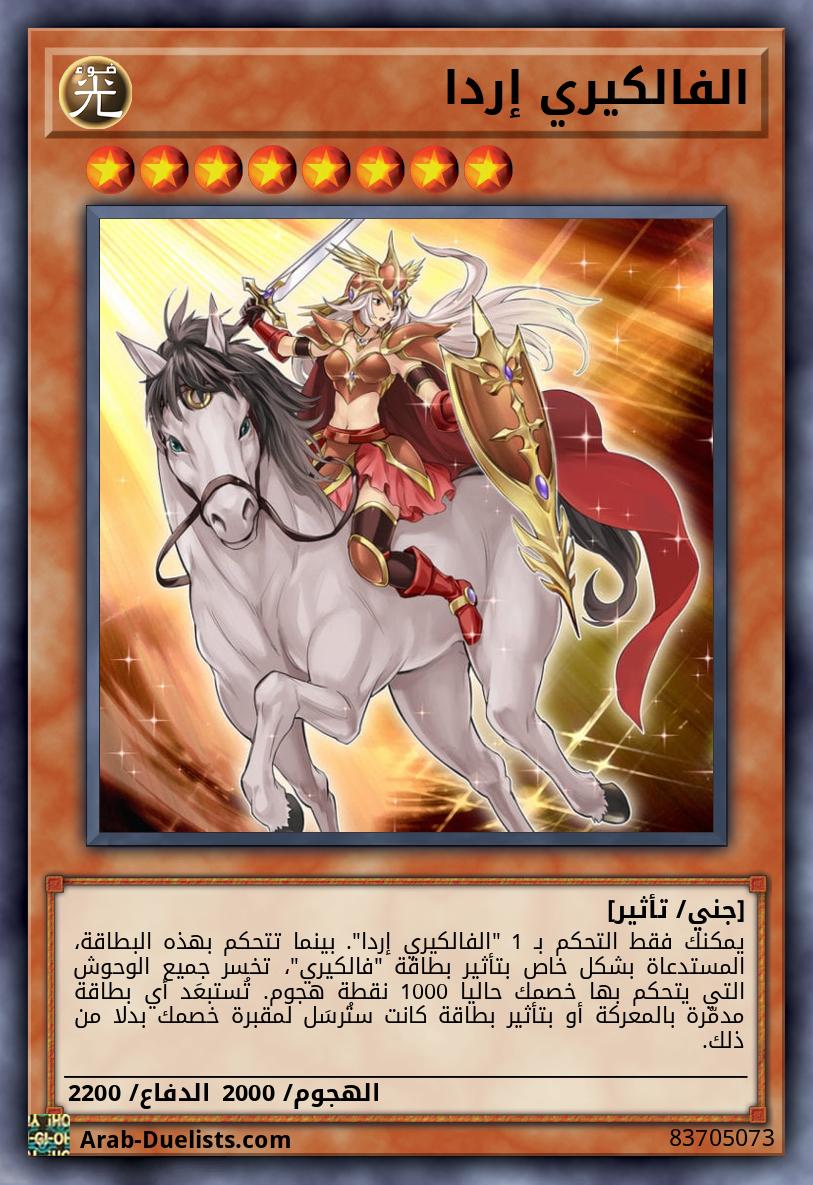 يمكنك فقط التحكم بـ 1 "الفالكيري إردا". بينما تتحكم بهذه البطاقة، المستدعاة بشكل خاص بتأثير بطاقة "فالكيري"، تخسر جميع الوحوش التي يتحكم بها خصمك حاليا 1000 نقطة هجوم. تُستبعَد أي بطاقة مدمّرة بالمعركة أو بتأثير بطاقة كانت ستُرسَل لمقبرة خصمك بدلا من ذلك.