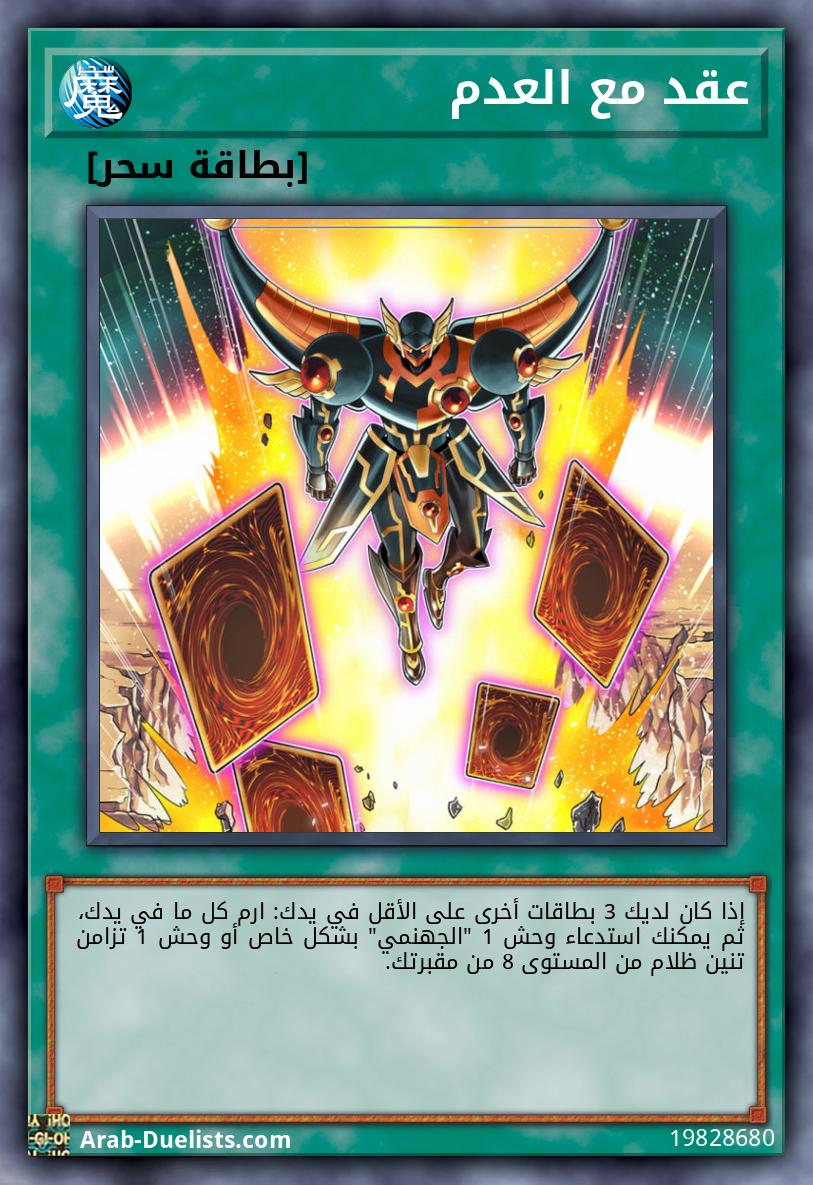 يمكنك رمي بطاقة 1؛ أرسل وحش 1 شيطان من مجموعتك إلى المقبرة. يمكنك إرسال هذه البطاقة المكشوفة من منطقة السحر والفخ خاصتك إلى المقبرة؛ أرسل وحوش "آلي الجحيم" بأسماء مختلفة من يدك و / أو مجموعتك إلى مقبرتك، بما يصل لعدد الوحوش التي يتحكم بها خصمك والتي استُدعِيت بشكل خاص من المجموعة الإضافية. يمكنك فقط استخدام تأثير واحد "العدم نهاية العالم" كل دور، ومرة واحدة فقط ذلك الدور.